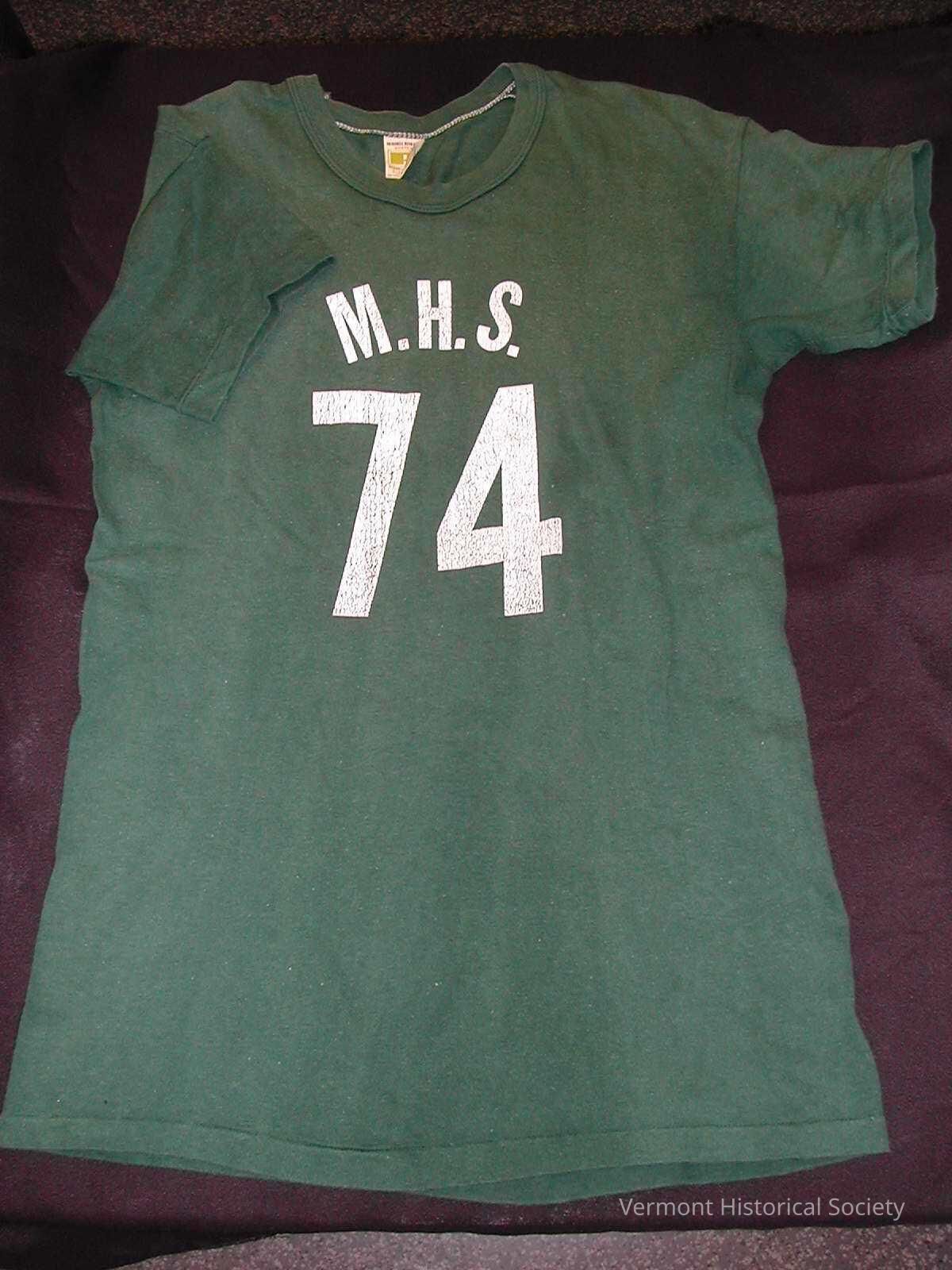 Short-sleeved green t-shirt printed on the front with the inscription, "M.H.S. 74", in white.