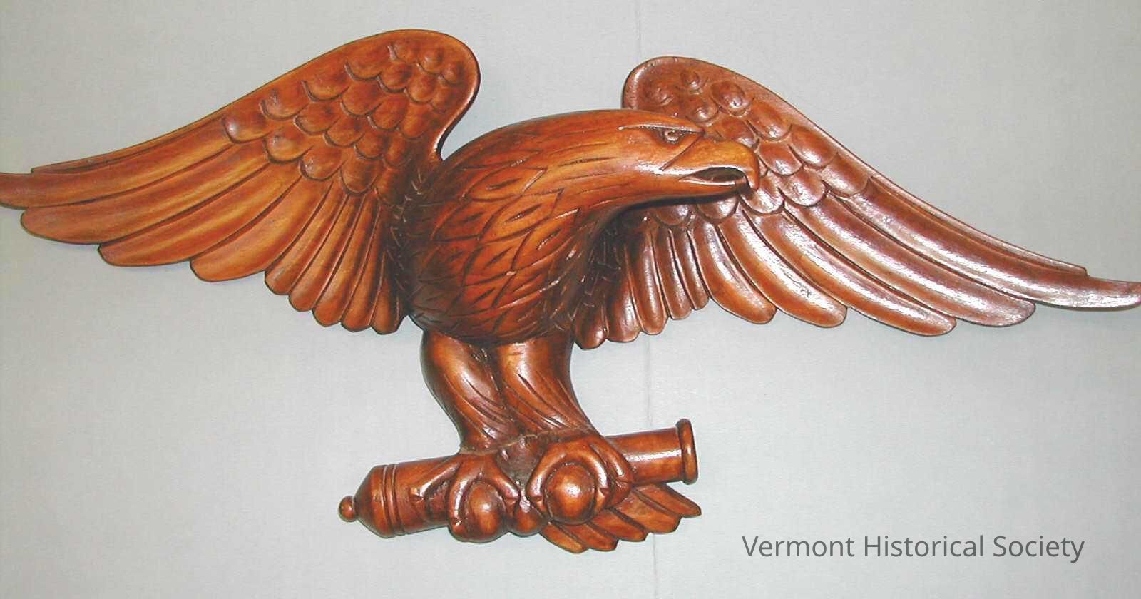 Bas-relief carving of an eagle carrying a cannon in its talons. Its wings are spread outward, and its head is turned to its left. The labels "LYNDES" and "152" are carved into the back of each, and there is a metal hanging bracket screwed into the back. There are small (1/16-inch) holes drilled into th eback of each wing near the tips, and some at the back of the cannon.