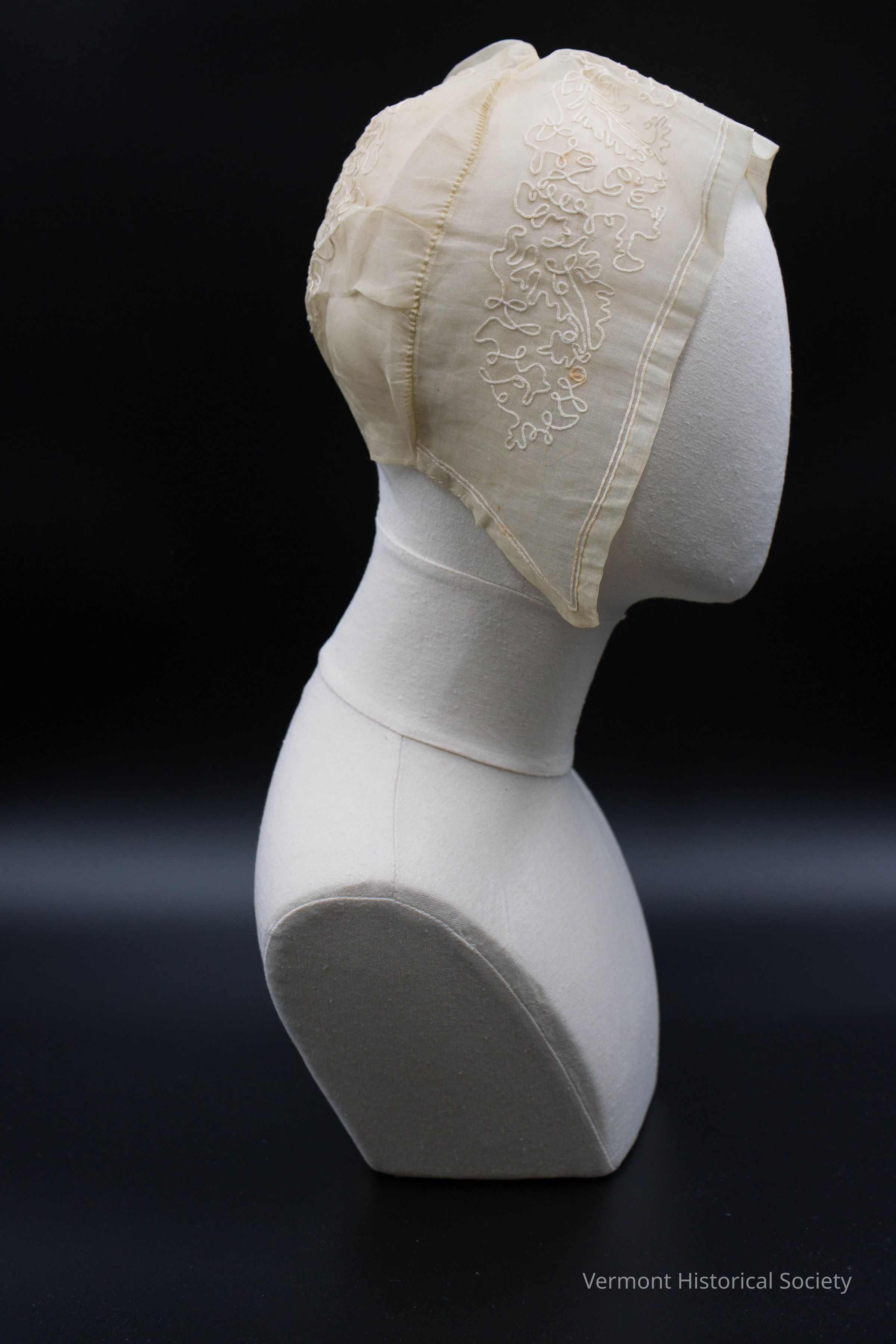 Heavily starched sheer white cotton cap with couched braid decoration. The cap is made in two parts: the brim and the crown. The crown is gathered to the brim and has a narrow drawstring along the bottom edge. The brim angles downward at the sides. Both the brim and crown have the couched decoration in a pattern abstract swirls and leaves.