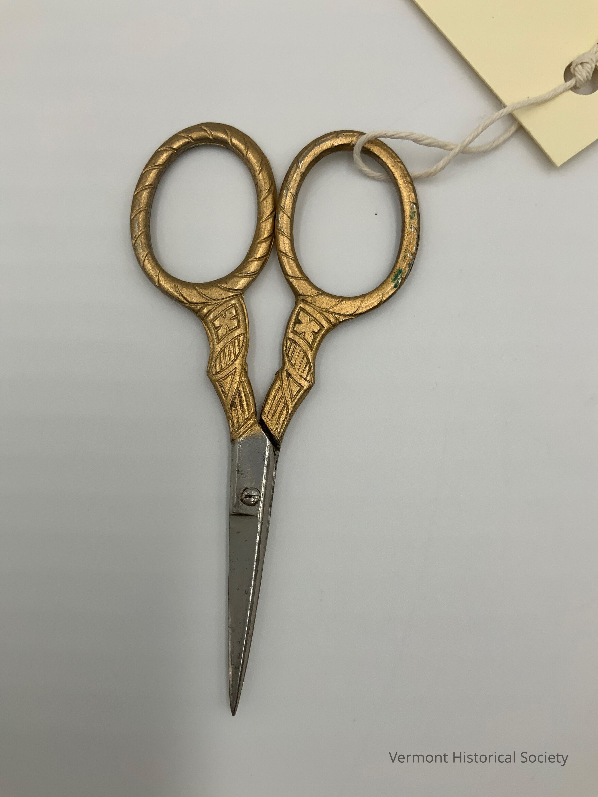 Sewing scissors with decoratively cast handles. The handles are plated with brass and cast with a decorative geometric pattern.