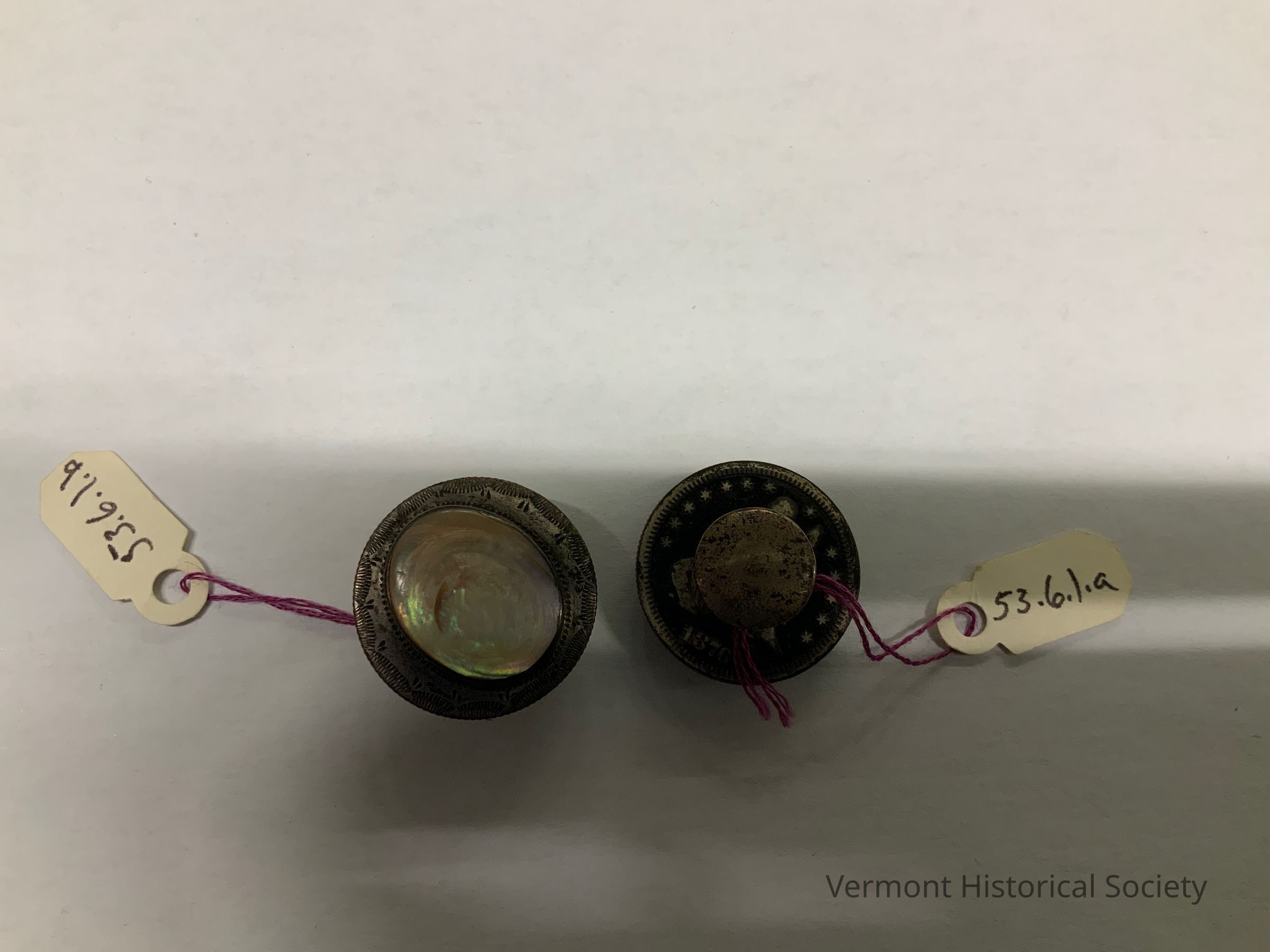Cuff studs made from nacre (mother of pearl) and coins. The face shows an oval piece of nacre mounted on a round, flat piece of metal with a decoratively engraved border. The reverse shows the original surface of the coins, with the dates 1872 and 1876.