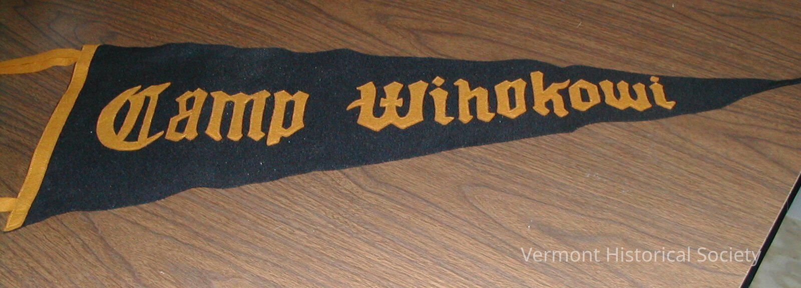 Triangular green felt pennant appliquéd in yellow felt with the words, "Camp Wihokowi" in gothic letters. The short end of the pennant is bound with yellow felt and there are felt tabs attached to either corner of the short end.