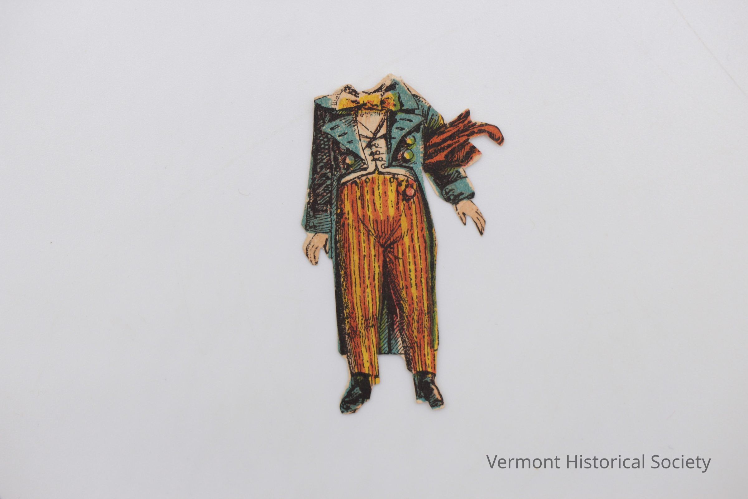 Tiny suit for a paper doll. The suit consists of a white vest, yellow bow tie, blue tailcoat, and red-and-yellow striped pants. There is red fabric or a red feather under the left arm.Context