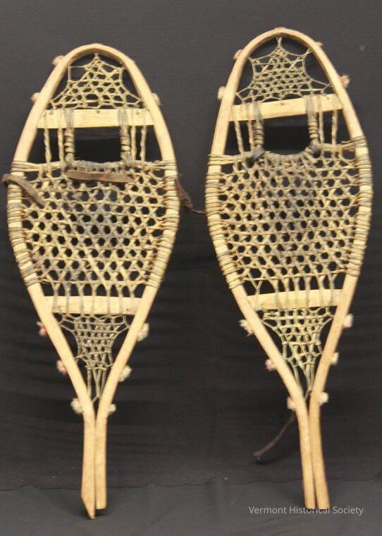 Caned snowshoes sized for a child. The frame of each shoe is made of a single piece of wood bent into shape and held with two reinforcement bars across the middle. The inside of the shoe is webbed with sinew, woven into an open pattern. The attachment points of the webbing at the front and back are decorated with tufting. Leather straps woven through the center of the shoe hold the users feet in place.Context