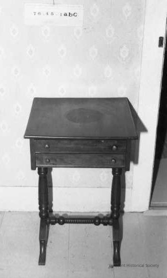Work table with 2 drawers, each with 2 small round brass pulls. The top is 1 board screwed to sides, while the rest of the table is pegged and dovetailed. It has 2 turned legs that branch into 2 claw feet each. A turned cross brace connects the 2 legs.