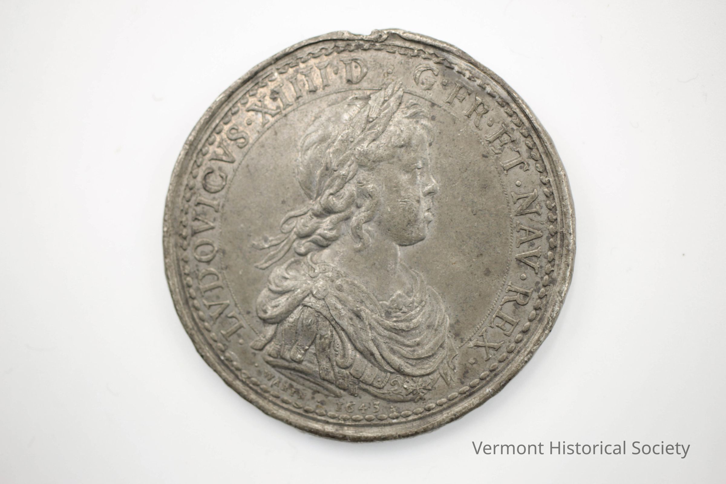 Designed and struck in 1643, this medal commemorated the ascension of Louis XIV to the throne of France. Since he was only four at the time, his mother, Anne of Austria, served as chair of the ruling regency council. Made of light metal, most likely including lead, this medallion was used as a trade good with the indigenous people of North America. A loop braised onto the top of the medallion allowed it to be worn on a cord. When that loop wore out, an intricate beaded pouch was made by the Innu (Montagnais) owner.