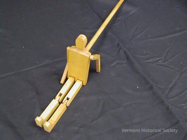 Jointed wooden doll on a stick. The body of the doll is a rectangular block made in one with the oval head. The arms are held to the side of the body with brass brads. The legs are held with a bar through holes at the top of the leg piece, as are the knees. There is a long wooden dowel attached to the back of the doll.