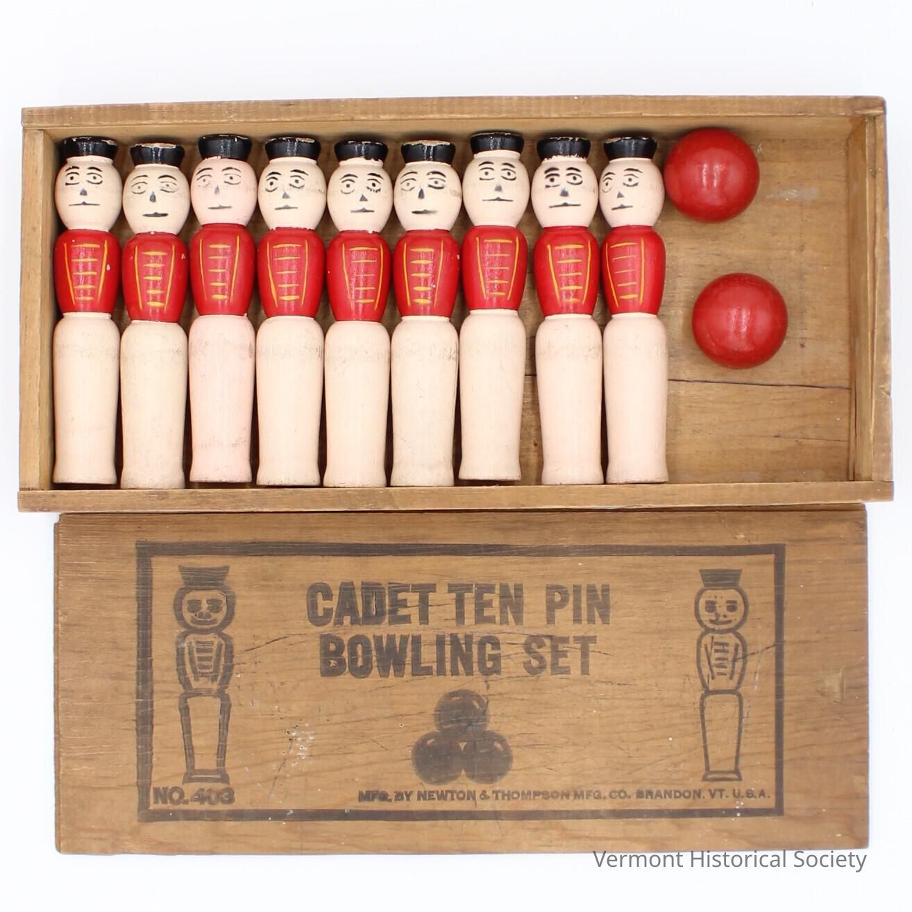 Boxed toy bowling set with pins painted as soldiers. Each of the 9 pins is painted pink with a red jacket and black hat. There are two red-painted balls. The set is held in a wooden box with a slide-off lid. The lid is printed with images of the soldier pins and the inscription, "CADET TEN PIN BOWLING SET".Context