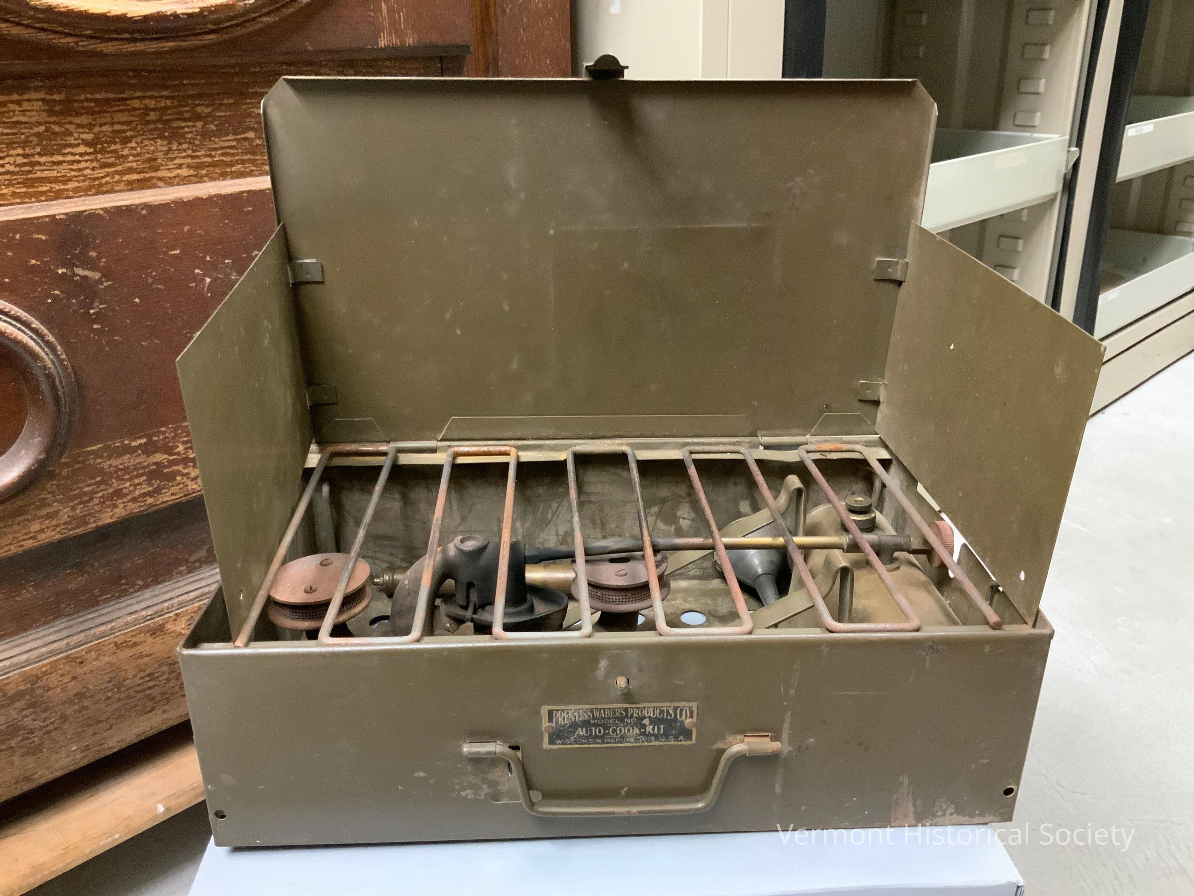 "a" stove; "b" box; "c" funnel; "d" cylinder pump. Stove is painted dark (military) green with two jets (burners). The box is white (dirty) corregated cardboard. Black block letters read: 'THIS CONTAINS/ MODEL NO. 4...' the white mailing label covers the bulk of the rest. The mailing label is from "Montgomery Ward & Co. Shipped from Baltimore, Maryland" "Ship to: Mrs Winn L. Taplin PO Fairfax B 66/ West Georgia VT/ B&O NYNHH Cedar Hill/TFR CV" The stove's cooking surface is 1/4" metal rods bent in tight boxy s-curves. A brass fuel tank is at the far right side of the inside.