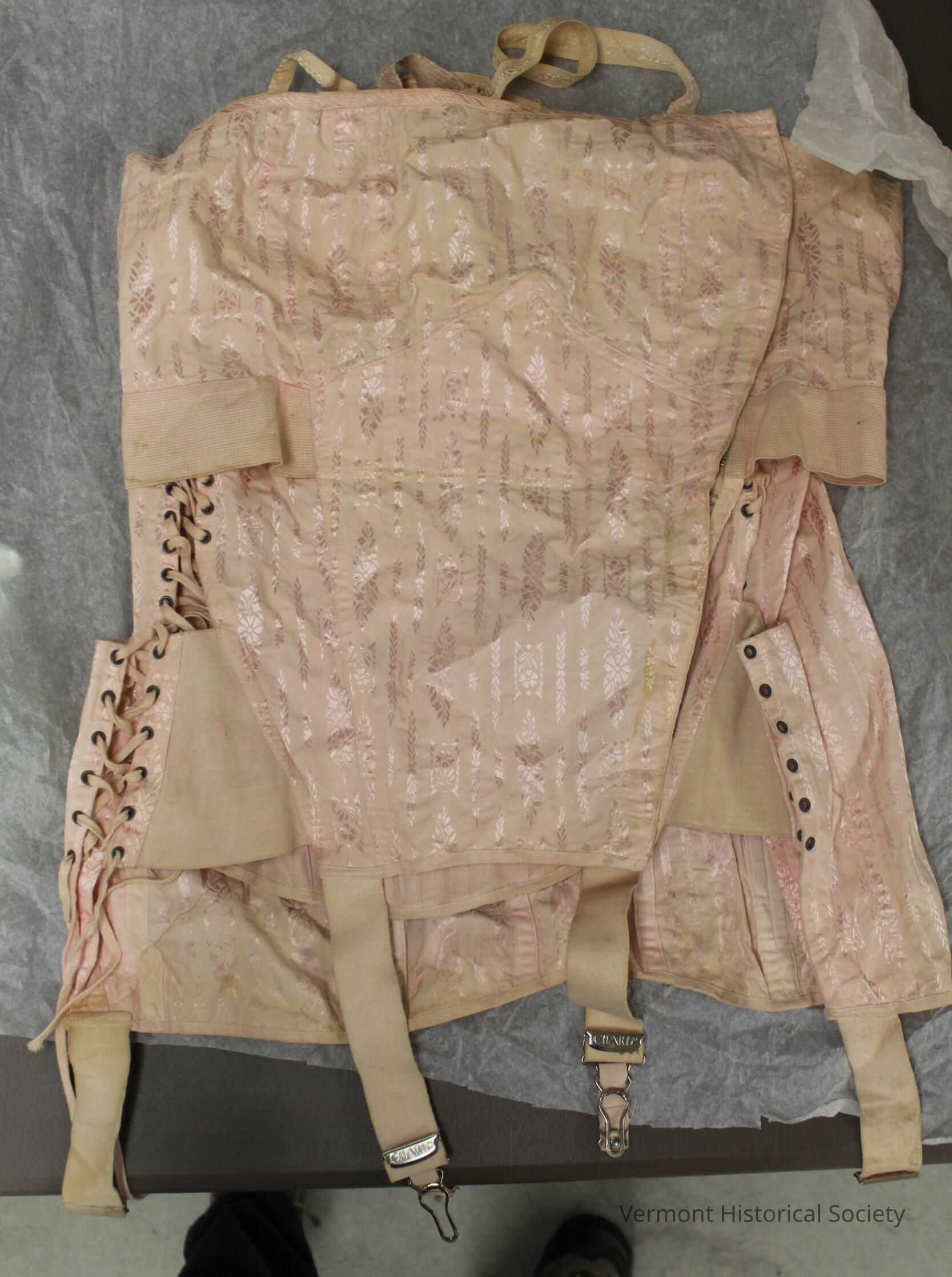 Pink silk corset. It is gored to accommodate pregnancy. The size is adjustable via 4 areas of lacing on the sides. There is an interior underbust corset beneath the outer layer that is boned. It opens and closes with a row of hooks and eyes along the back. There are 4 garter straps.