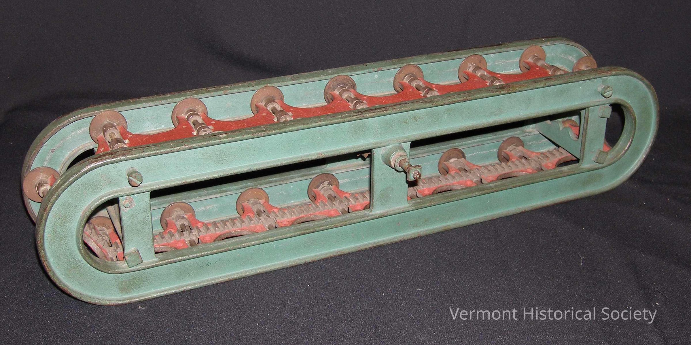Patent model of a horse-powered machine. The model consists of two green metal ovals connects in the middle with three green metal brackets. A red metal track sits in grooves along the inside of the U-shaped pieces, creating a continuous loop.