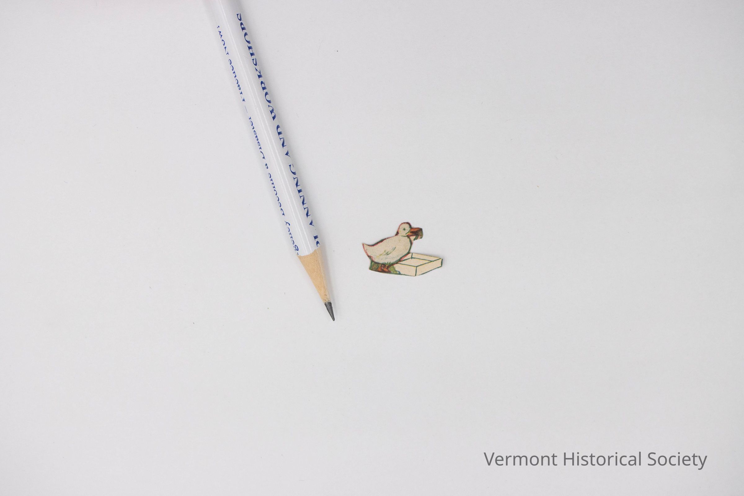 Tiny, printed paper doll showing a white duck eating grass from a white box. The back shows a portion of a page of a sales catalog.Context