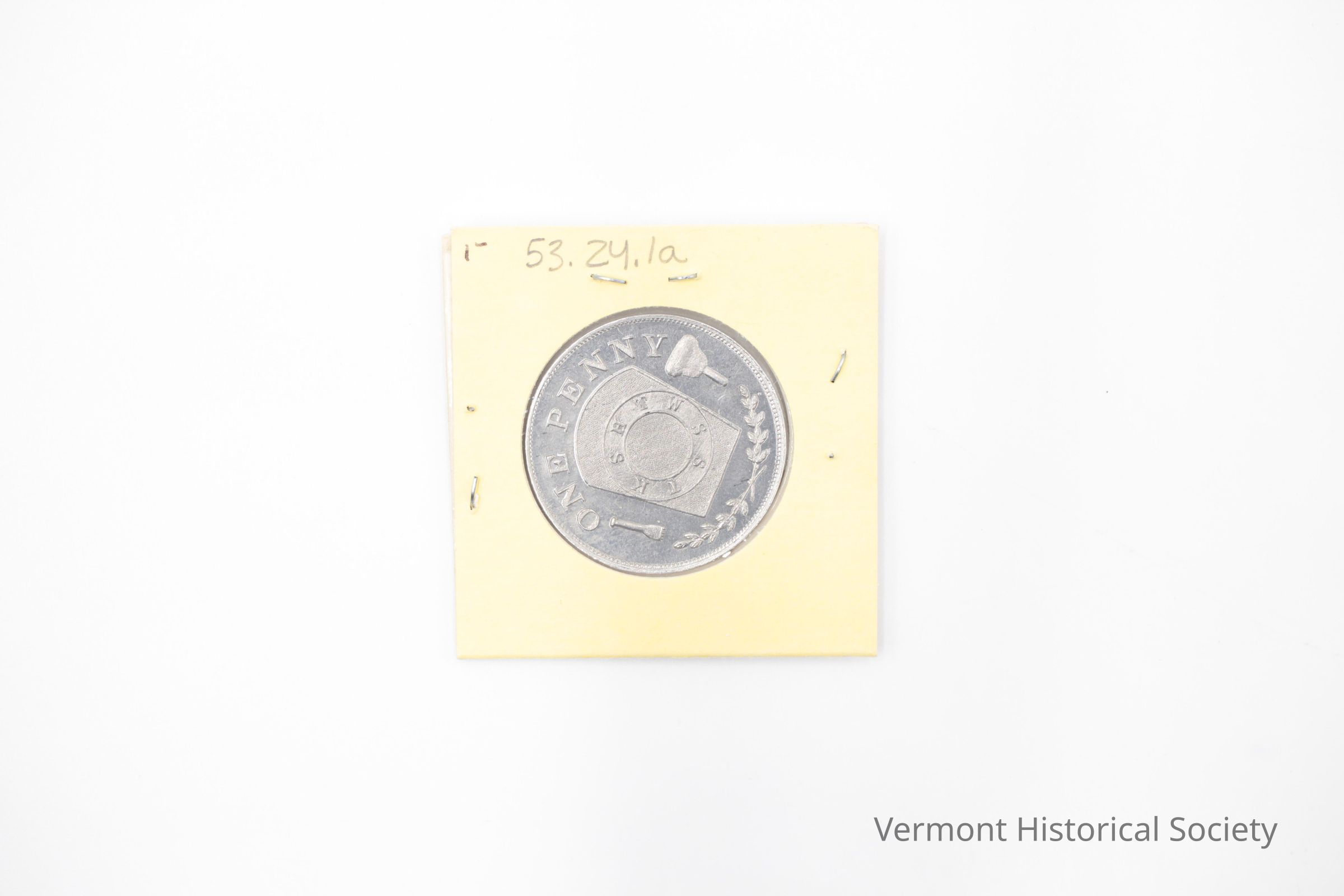 Silver-toned metal token with the words "ONE PENNY" on the obverse with an olive branch at the bottom, a tablet with a circle of initials "H T W S S T K S" in the center, a chisel, and a funnel. On the other side of the token are the words, "Cleveland Chapter No. 20 R.A.M. Newport, Vt.”Use