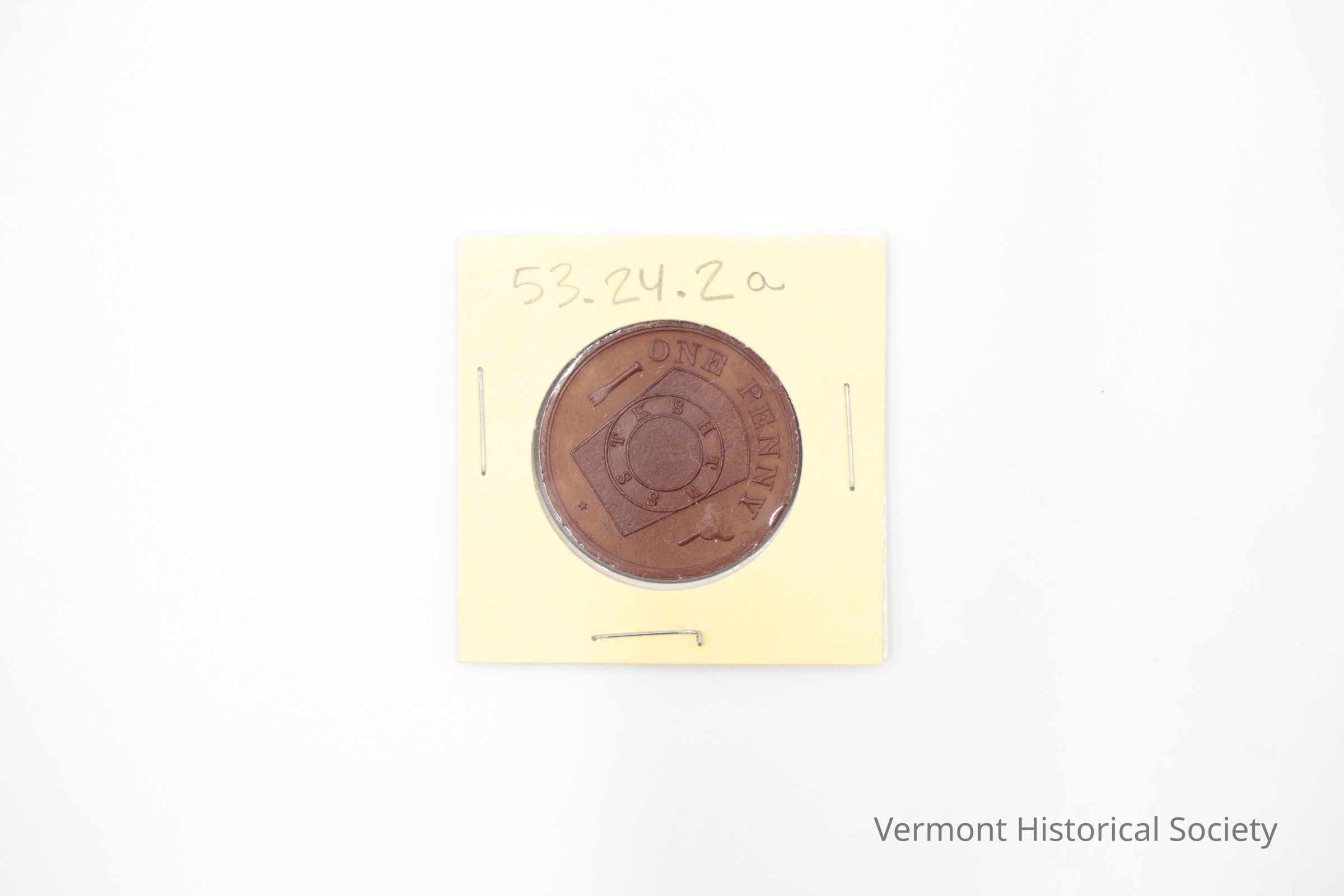 Copper token the words "ONE PENNY" on the obverse with an olive branch at the bottom, a tablet with a circle of initials "H T W S S T K S" in the center, a chisel, and a funnel. On the other side of the coins are the words, "Cleveland Chapter No. 20 R.A.M. Newport, Vt.Use