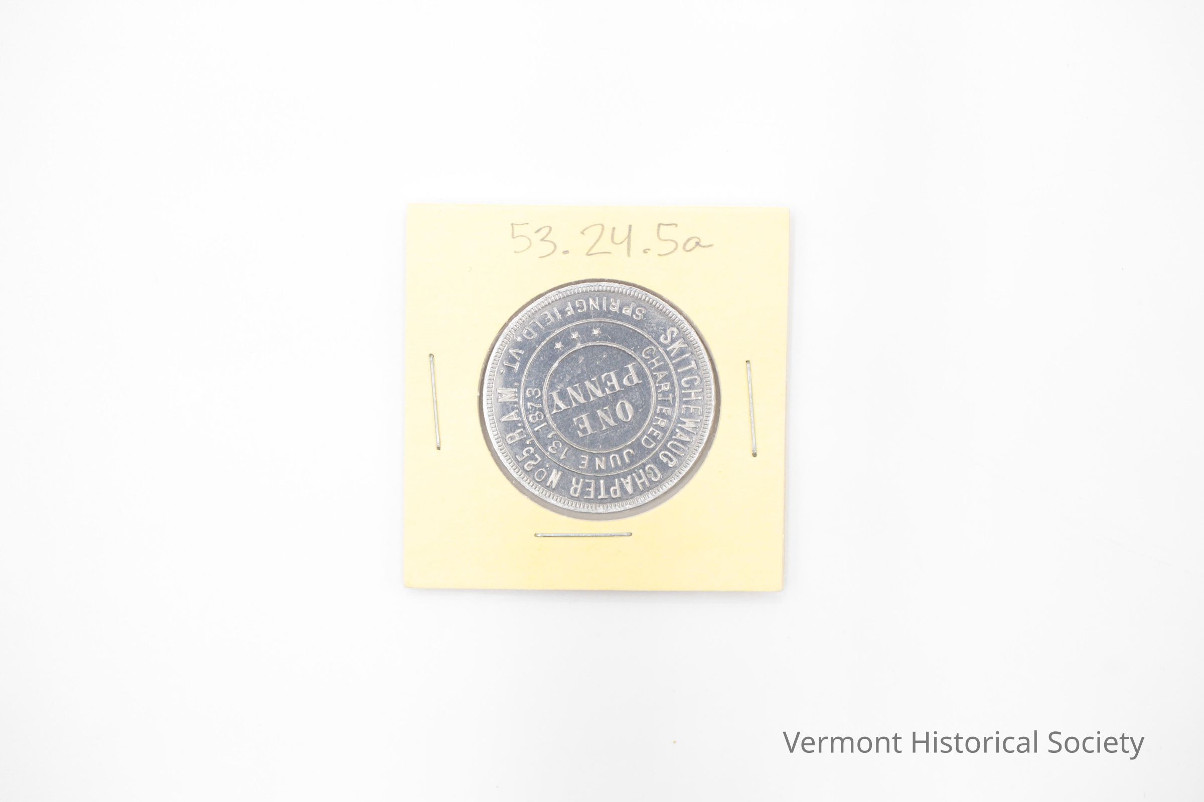 Aluminum token with masonic imagery on one side and an inscription on the other. One side has a wedge (possibly representing a fez hat) with circle on the inside bearing the inscription, "H T W S S T K S". Flanking the shape are a set of masonry tools and an urn. The other side has the inscription "ONE PENNY" in the center, "SKITCHEWAUG CHAPTER NO. 25 R. A. M. / SPRINGFIELD, VT." around the outer edge, and "CHARTERED JUNE 13, 1873" inside of the first.Use