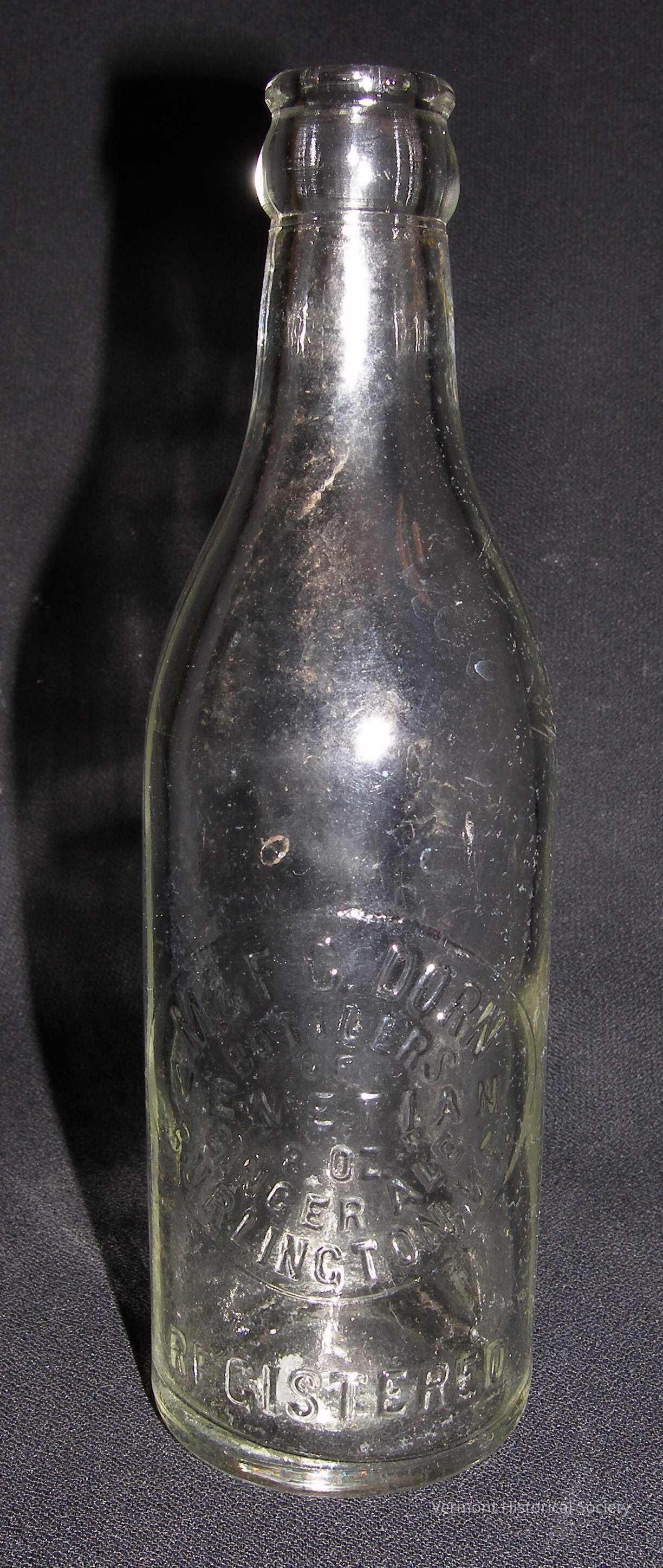 Clear glass bottle with the molded inscription, "M. & F. C. DORN BOTTLERS OF VENETIAN 8 0Z. GINGER ALE BURLINGTON, VT. REGISTERED"