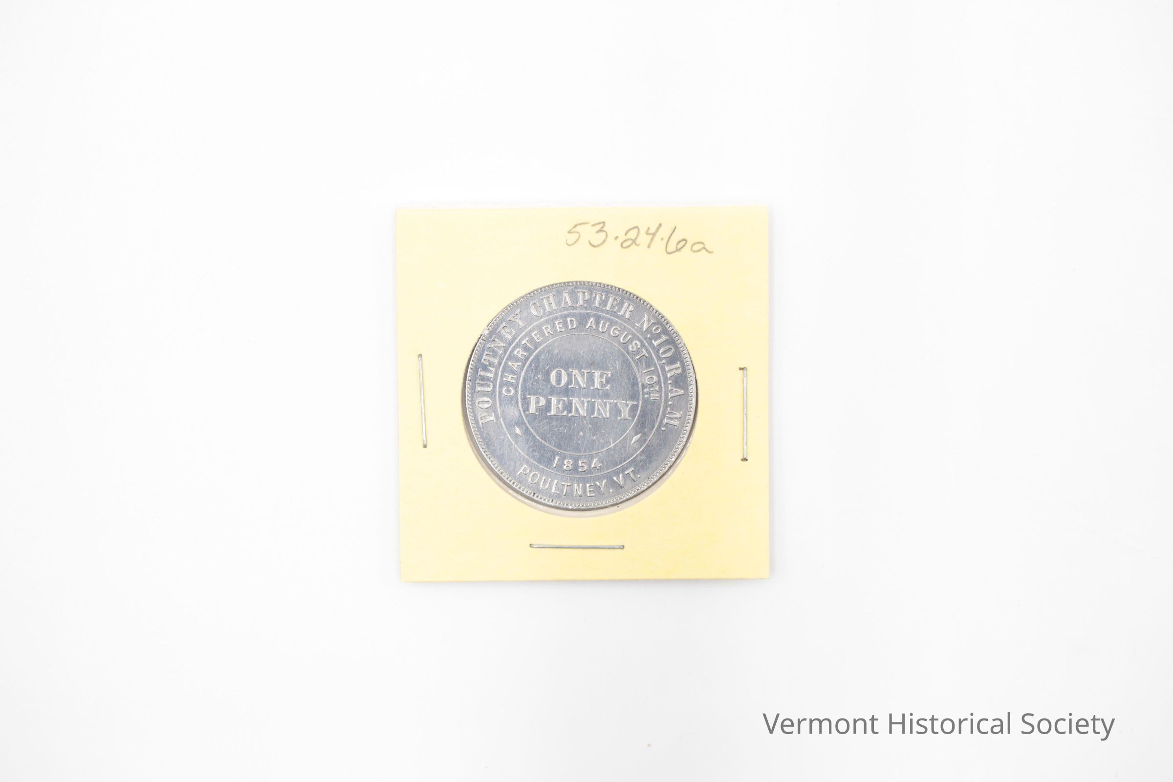 Silver coin with masonic imagery on one side and an inscription on the other. One side has a wedge (possibly representing a fez hat) with circle on the inside bearing the inscription, "H T W S S T K S". Flanking the shape are a chisel and a hammer. The other side has the inscription "ONE PENNY" in the center, "POULTNEY CHAPTER NO. 10 R. A. M. / POULTNEY, VT." around the outer edge, and "CHARTERED AUGUST 10TH 1854" inside of the first.Use