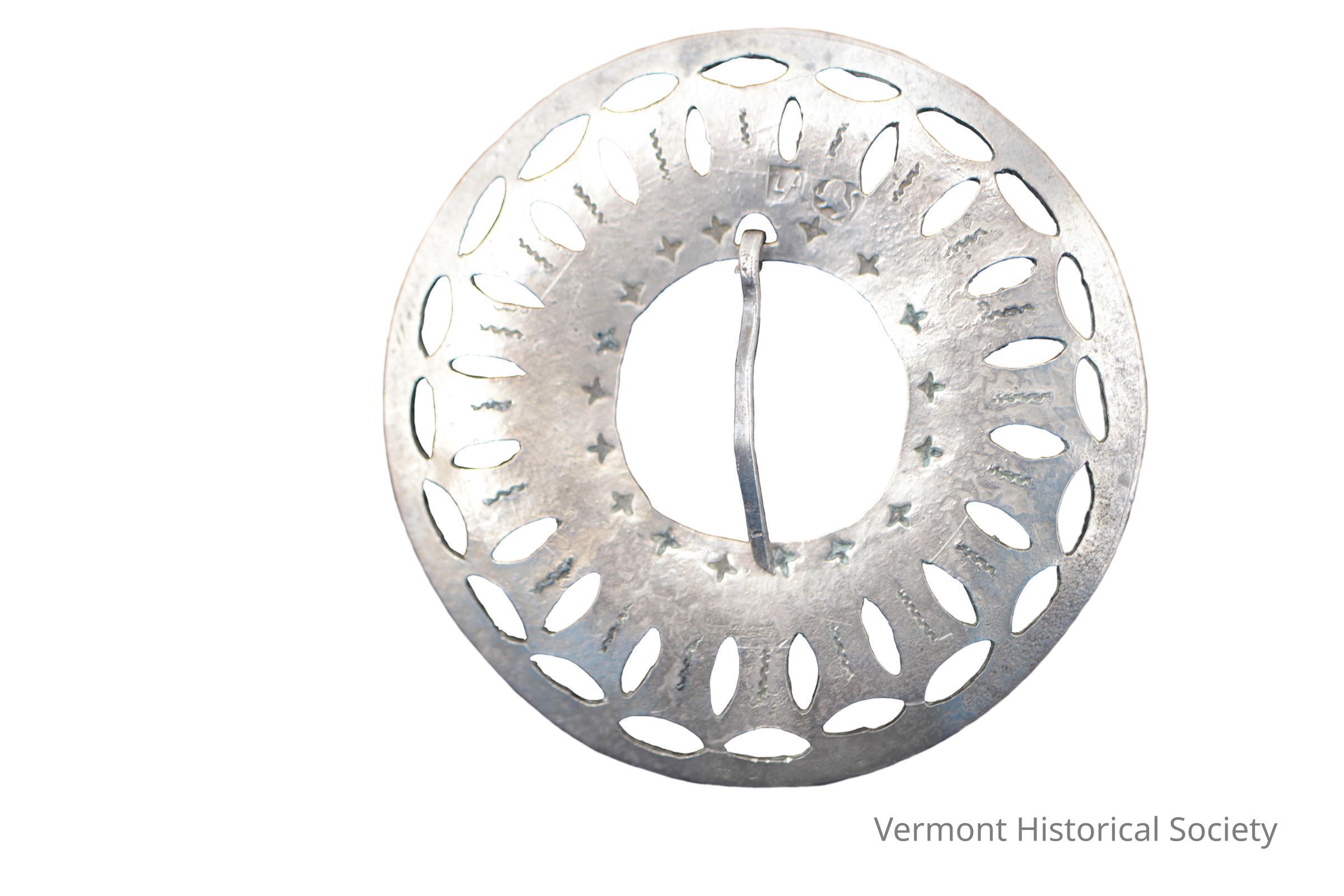 Starting at first contact, Europeans traded metal and glass items to indigenous people in exchange for assistance, furs, food, shelter, and other necessities. This silver clasp or brooch was made specifically for trade by a known French silversmith living in Montreal. The clasp descended in an Abenaki family and was last worn by Abenaki Frederick Wiseman at the Vermont recognition ceremony in 2011.