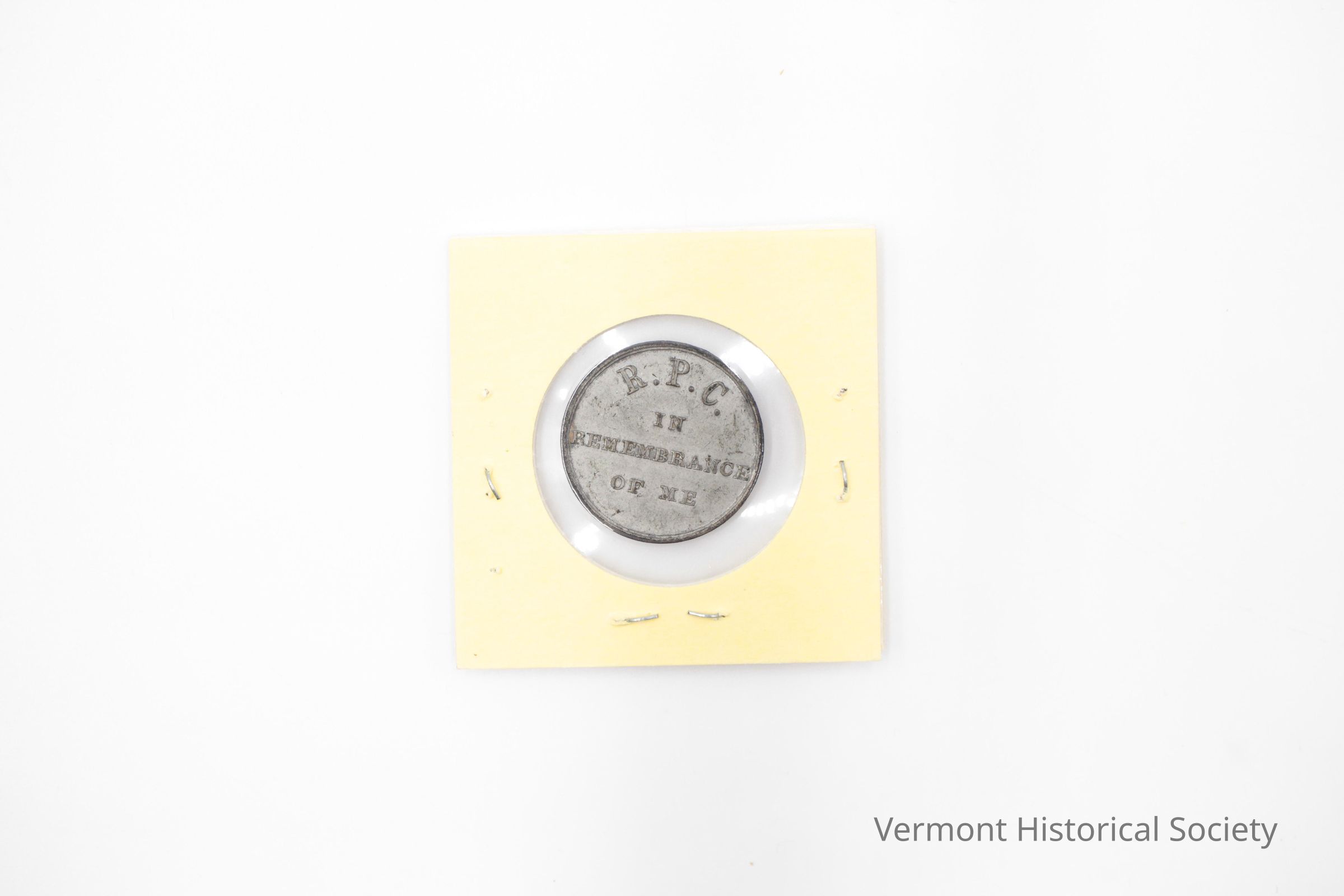 Silver communion token with an image of a burning bush and the inscription, "THE BUSH WAS NOT BURNED R.P.C." on one side. The other side bears the inscription, "R.P.C. IN REMEMBRANCE OF ME".Use
