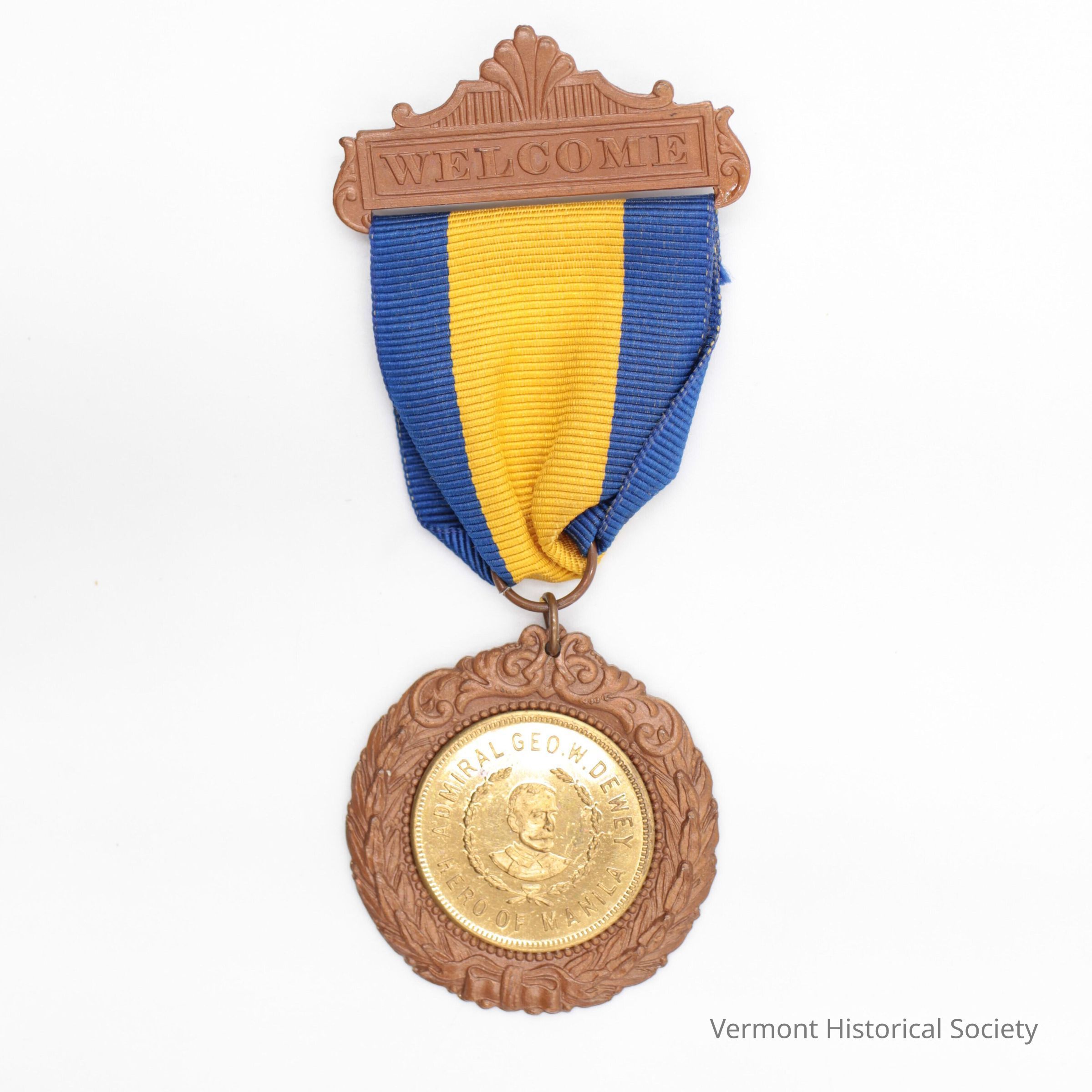 Commemorative medal consisting of a bar, a ribbon, and a medallion. The bar is copper and is molded with the word, "WELCOME". The grosgrain ribbon is striped yellow (center) and blue (edges). The medallion hangs from an eye rings looped through the ribbon and has a copper laurel wreath frame around a gold token. The token shows the bust of Admiral Dewey with the label, "ADMIRAL GEO. W. DEWEY / HERO OF MANILA". The back of the token shows a war ship with the label, "DEWEY'S FLAG-SHIP OLYMPIA 5,800 TONS".Context