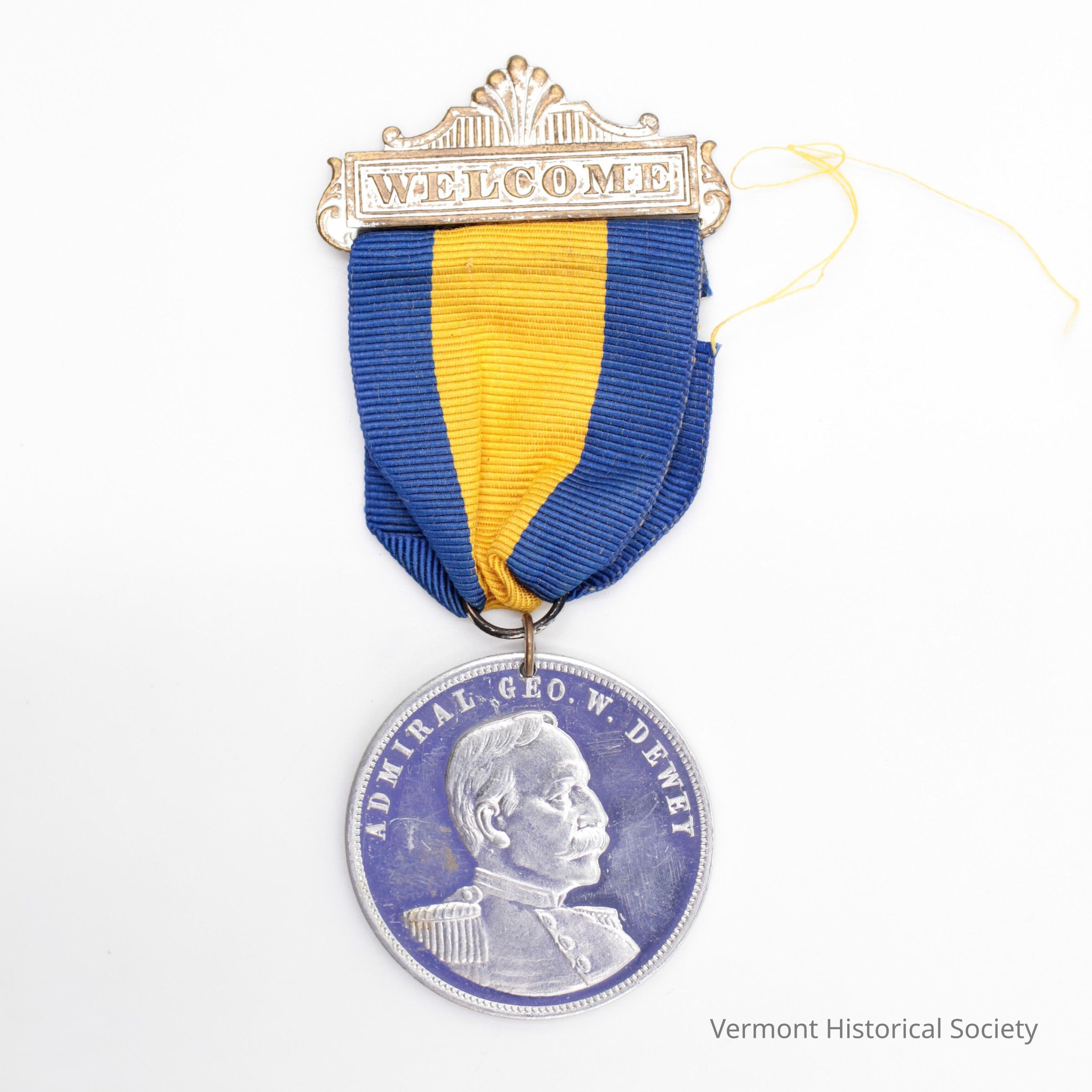Commemorative medal consisting of a bar, a ribbon, and a round medallion. The bar is silver plated and molded with the word, "WELCOME". The grosgrain ribbon is striped yellow (center) and blue (edges). The medallion hangs from an eye ring looped through the bottom of the ribbon and shows a bust portrait of Admiral Dewey and the inscription, "ADMIRAL GEO. WL. DEWEY". The back of the medallion shows a masted war ship with two steam chimneys and the label, "DEWEY'S FLAG-SHIP OLYMPIA. 5,800 TONS".Context