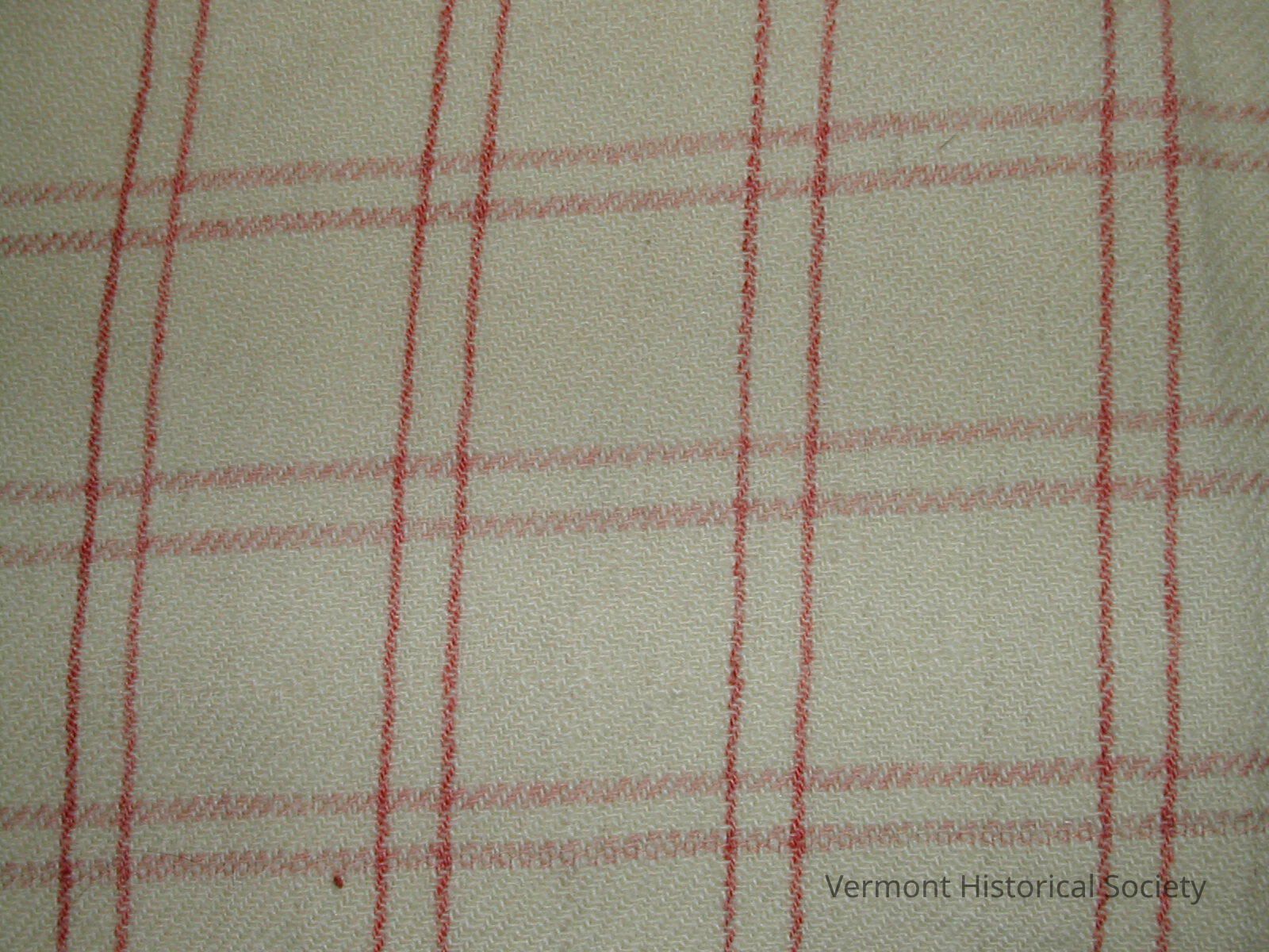 Twill-woven wool blanket with a windowpane check pattern of red on a white ground. It is one width of fabric, with selvedges on two sides and rolled hems on the other two sides.Context