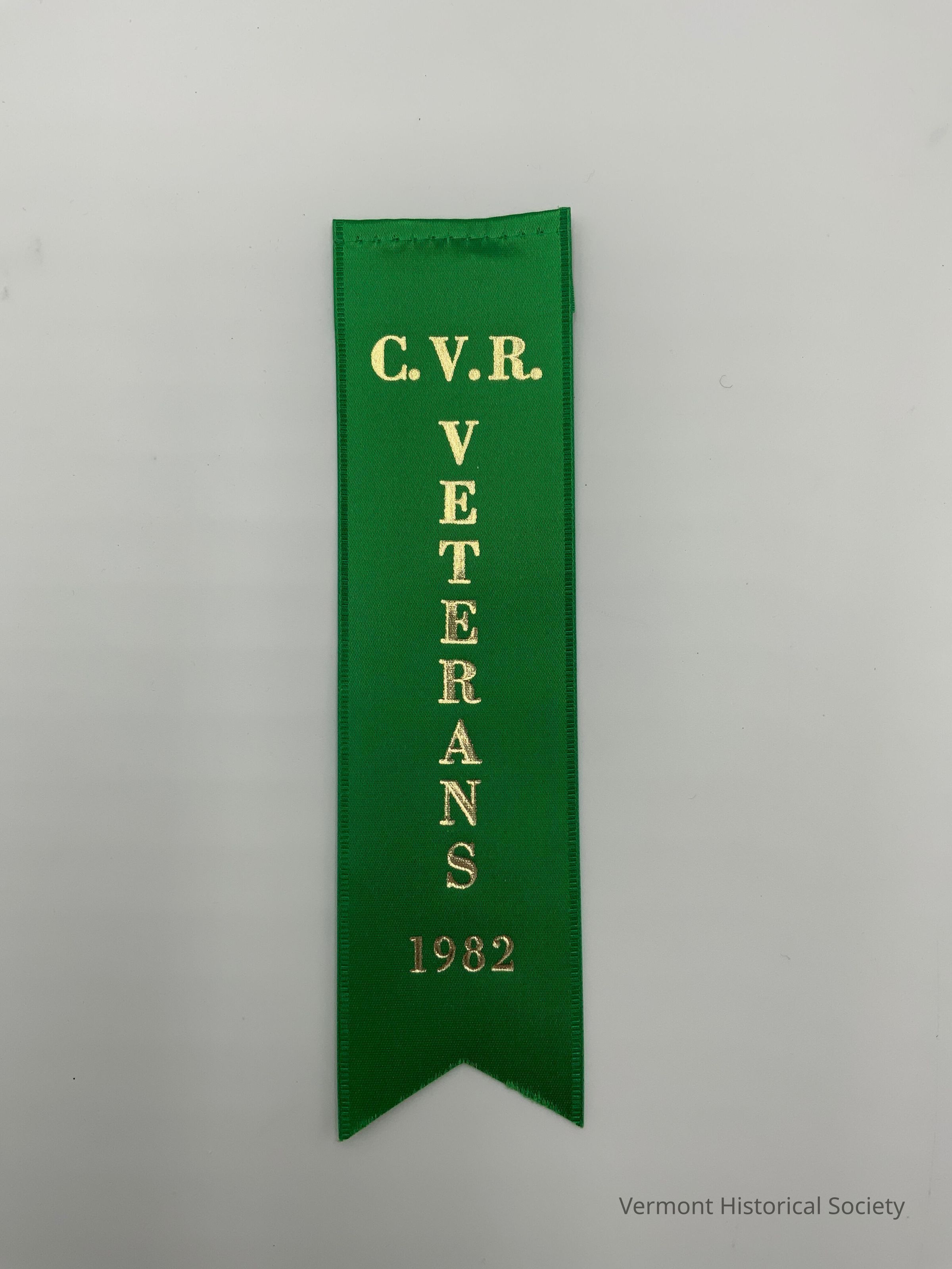 Green satin-woven ribbon with the stamped inscription, "C. V. R. VETERANS 1982". The bottom is cut into two points, and there is a safety pin attached to the top back.
