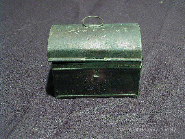 Miniature tin trunk. The rounded lid hinges upward from the back and there is a wire handle at the center top.Context