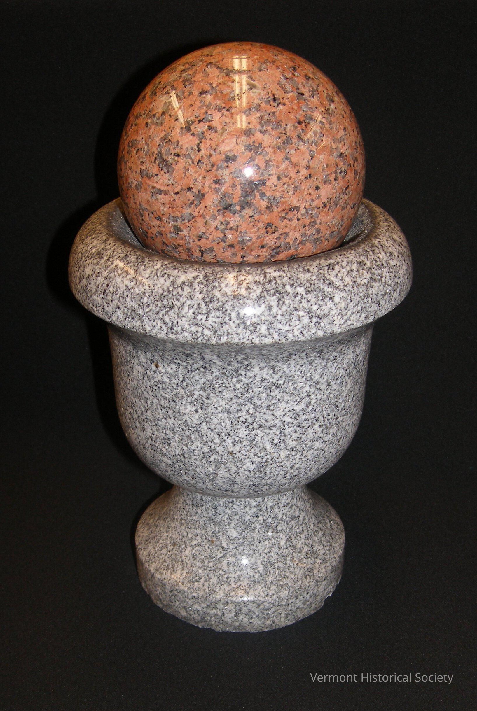 Made by donor's grandfather's company Grearson and Lane. Turned Barre gray granite urn and Salisbury pink ball. This urn and ball come from the same company as the other urn and ball, 2012.43.2.2a-b.Acquisition
