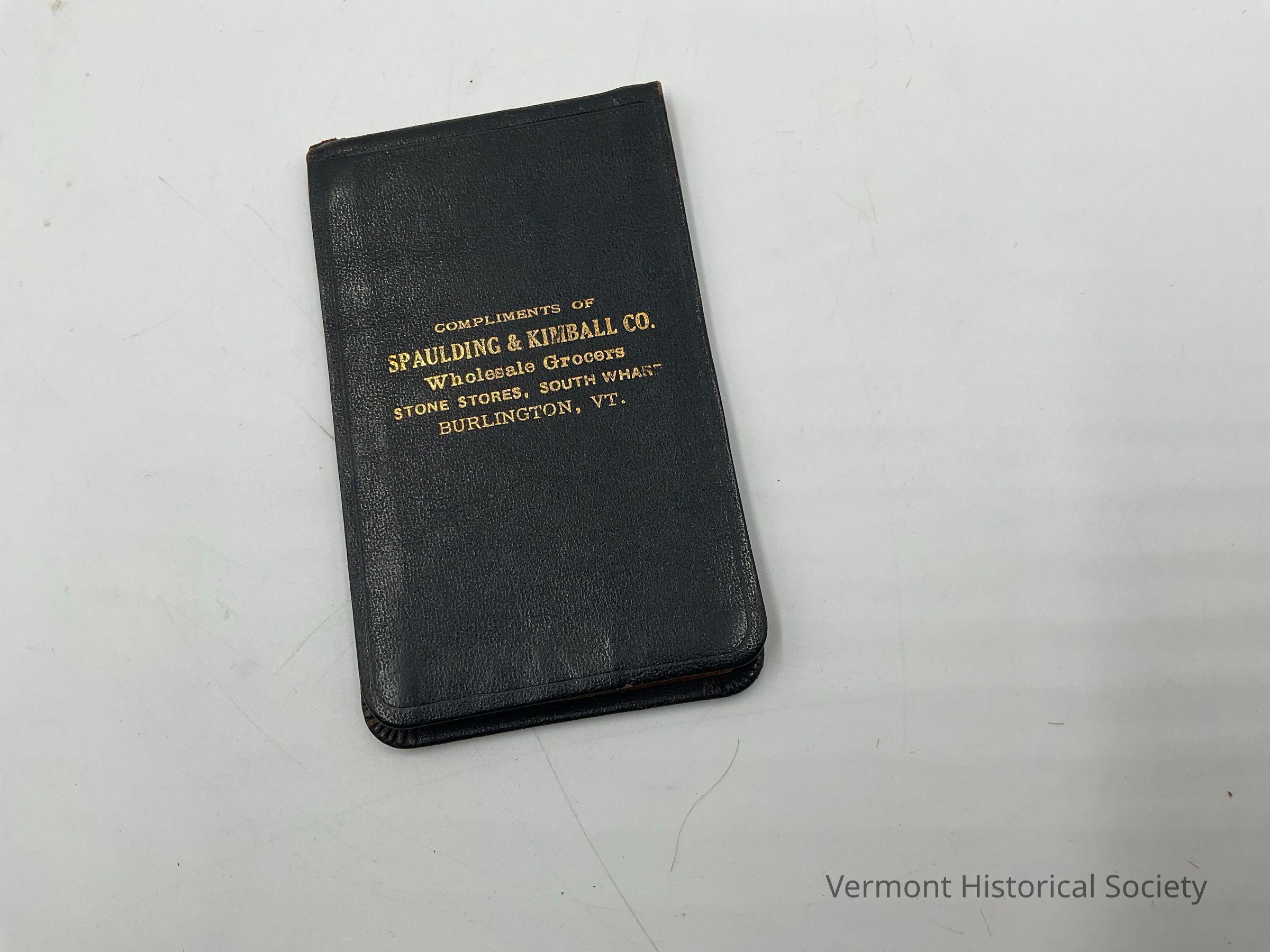 A black leather case with a calendar inside and a sleeve. On the cover of the case, printed in gold, is the following: "Compliments of Spaulding & Kimball Co., Wholesale Grocers, Stone Stores, South Wharf, Burlington, VT." This information is repeated on the inside flap, with a calendar for 1927 below.Context