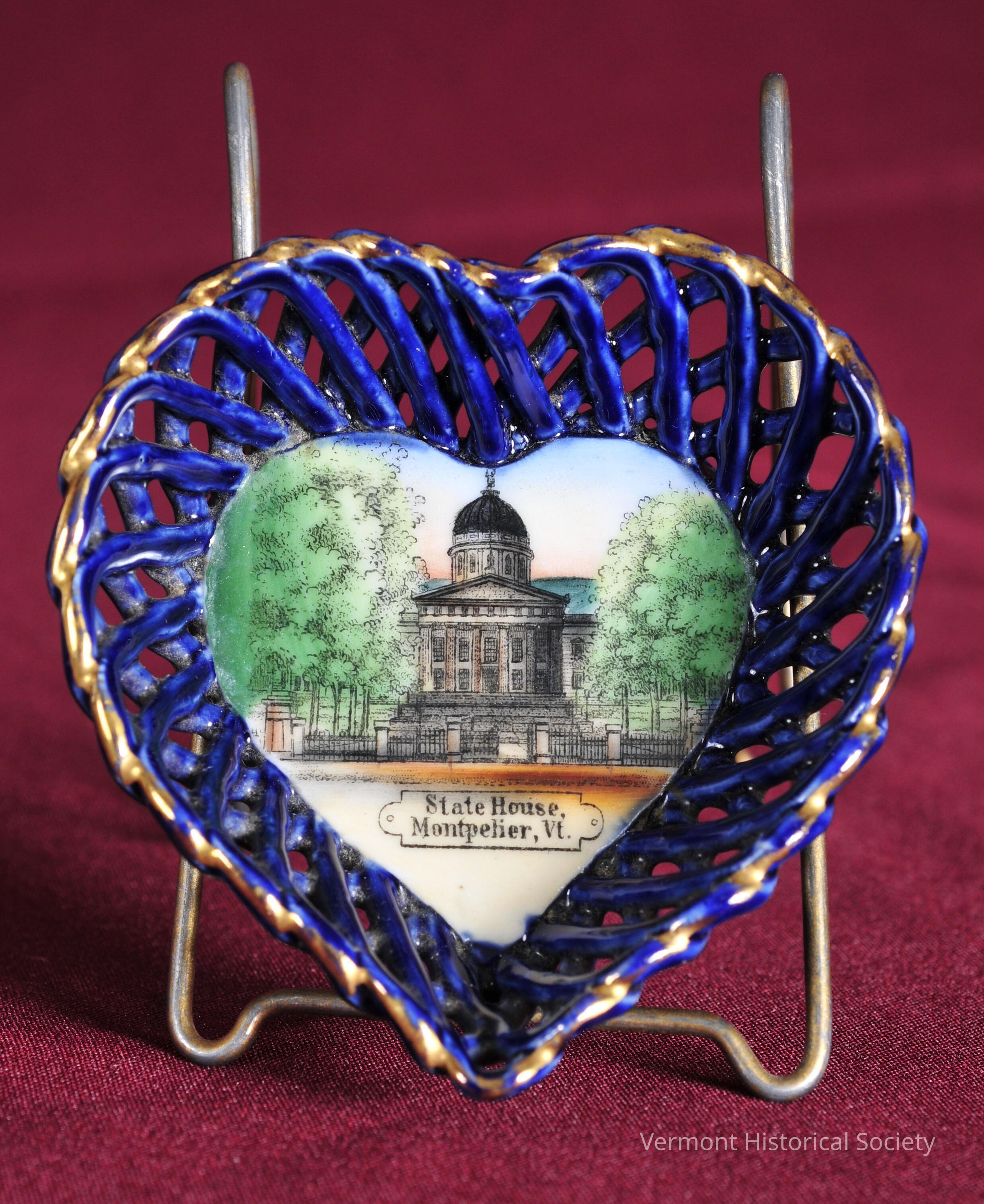 Heart-shaped ceramic basket. The center is printed with a colored image of a neoclassical building with a domed cupola and a six-columned portico. The building is colored brown with a black dome and the surrounding trees are colored green. The image is labeled, "State House, Montpelier, Vt." The rest of the dish is painted blue. The bottom has the maker's mark, "WHEELOCK DRESDEN GERMANY".