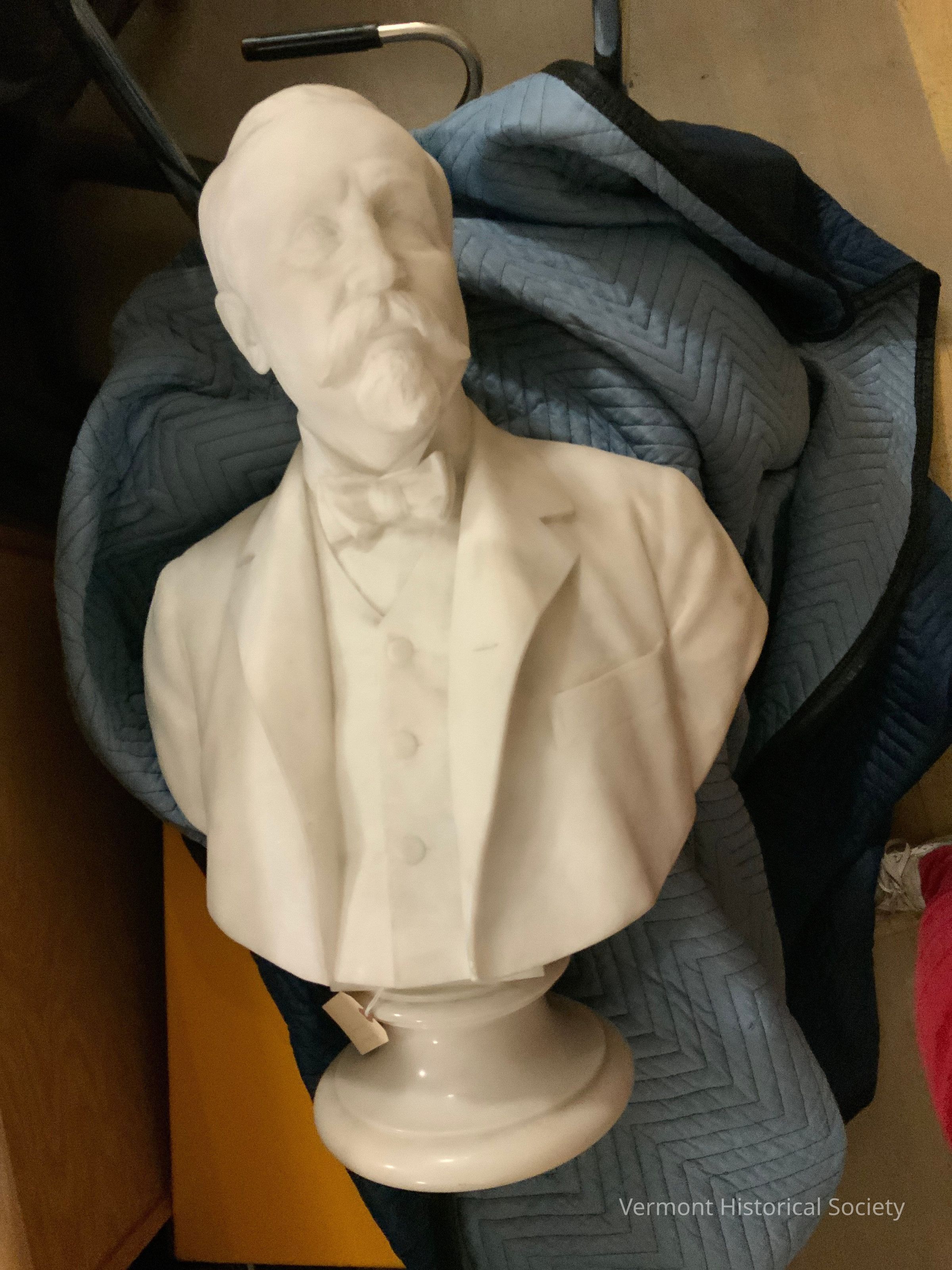 Carved marble self-portrait bust by Larkin Mead. Mead wears a suit jacket, buttoned vest, and a shirt with a tall collar and textured silk-like bowtie. Mead's short hair is combed neatly back from his face and his mustache and goatee also appear combed and styled. The bust rests on a short columnar base with turned and flared top and base edges.