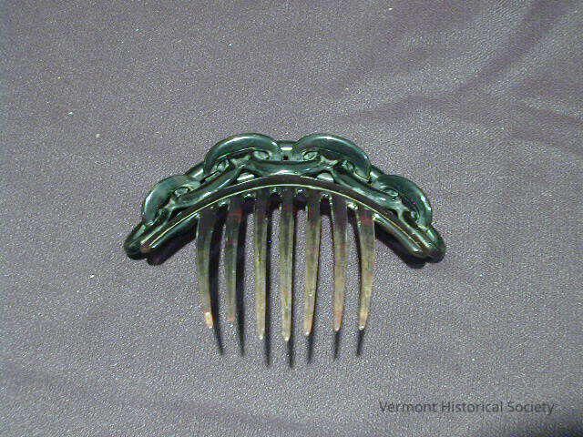 Decorative hair comb with a linked chain design. Five of the links are carved as one with the rest of the comb; four of the links are loose, inserted through the stationery links. There are seven slightly curved tines.