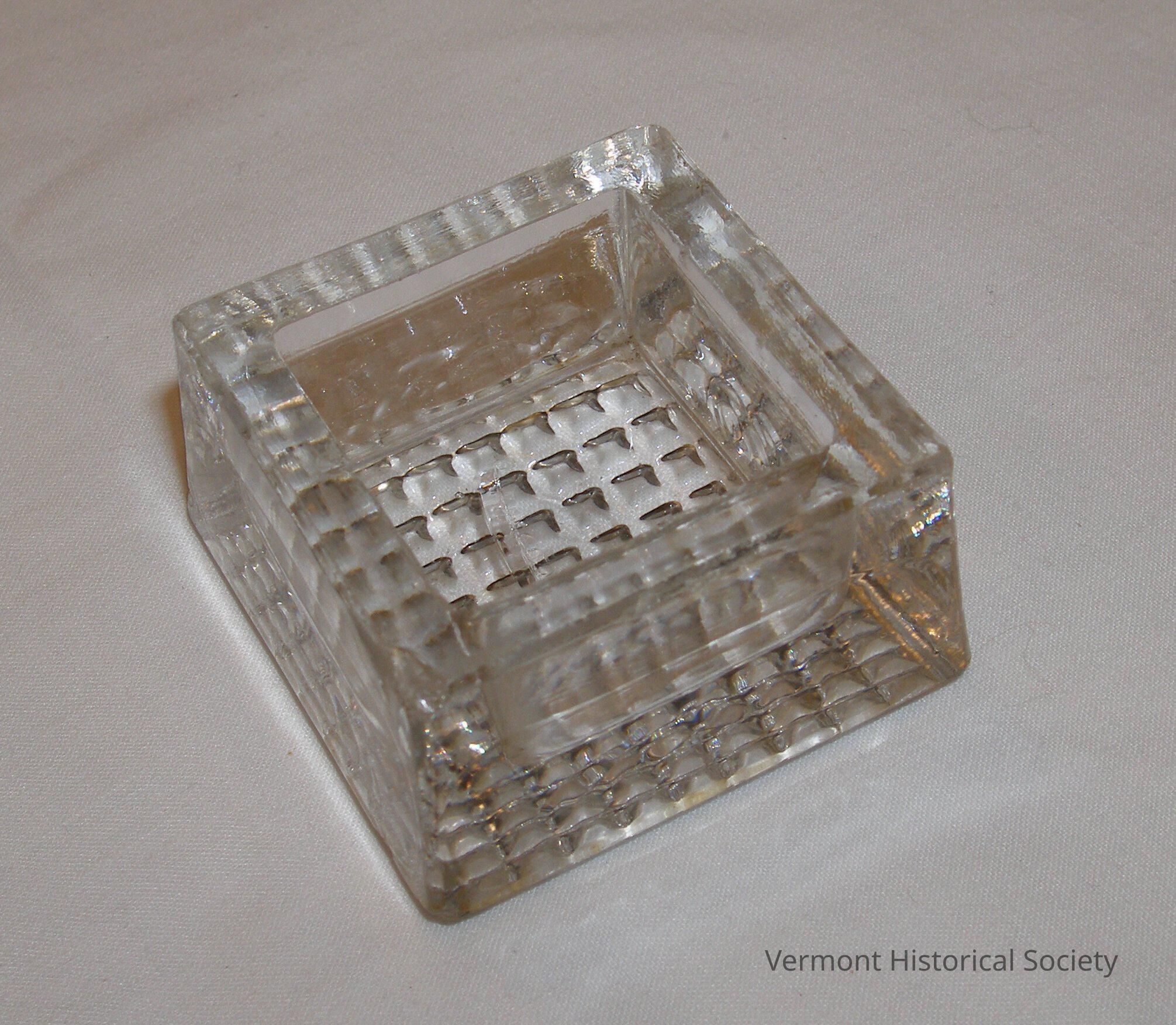 Square glass salt dish molded with a repeating design of squares on the base. The straight sides slope slightly inward toward the top.