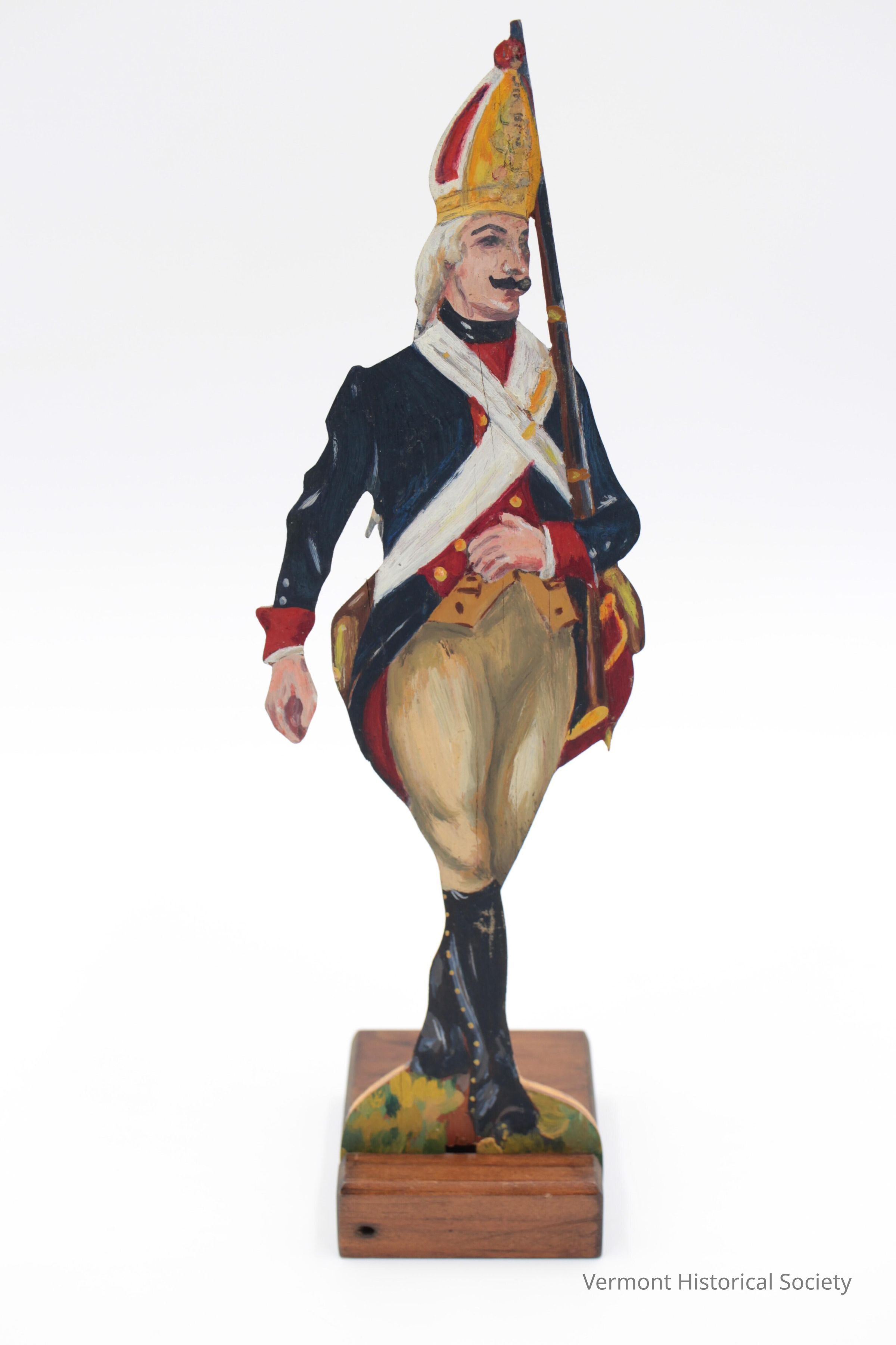 Plywood cutout figurine of soldier. The figure is painted on the front, and the plywood is left bare on the reverse. The soldier is shown wearing an eighteenth-century-style military uniform consisting of a tall gold hat, a blue coat trimmed with red, a tan waistcoat, fawn breeches, black leggings, and black shoes. He is holding a long gun over his left shoulder and has a curled black mustache. The figure sits in a slot within a rectangular wooden base. The back is incised with the inscription, "Green Mountain Ranger / Parade Uniform / Horace Mills Abrams".Context