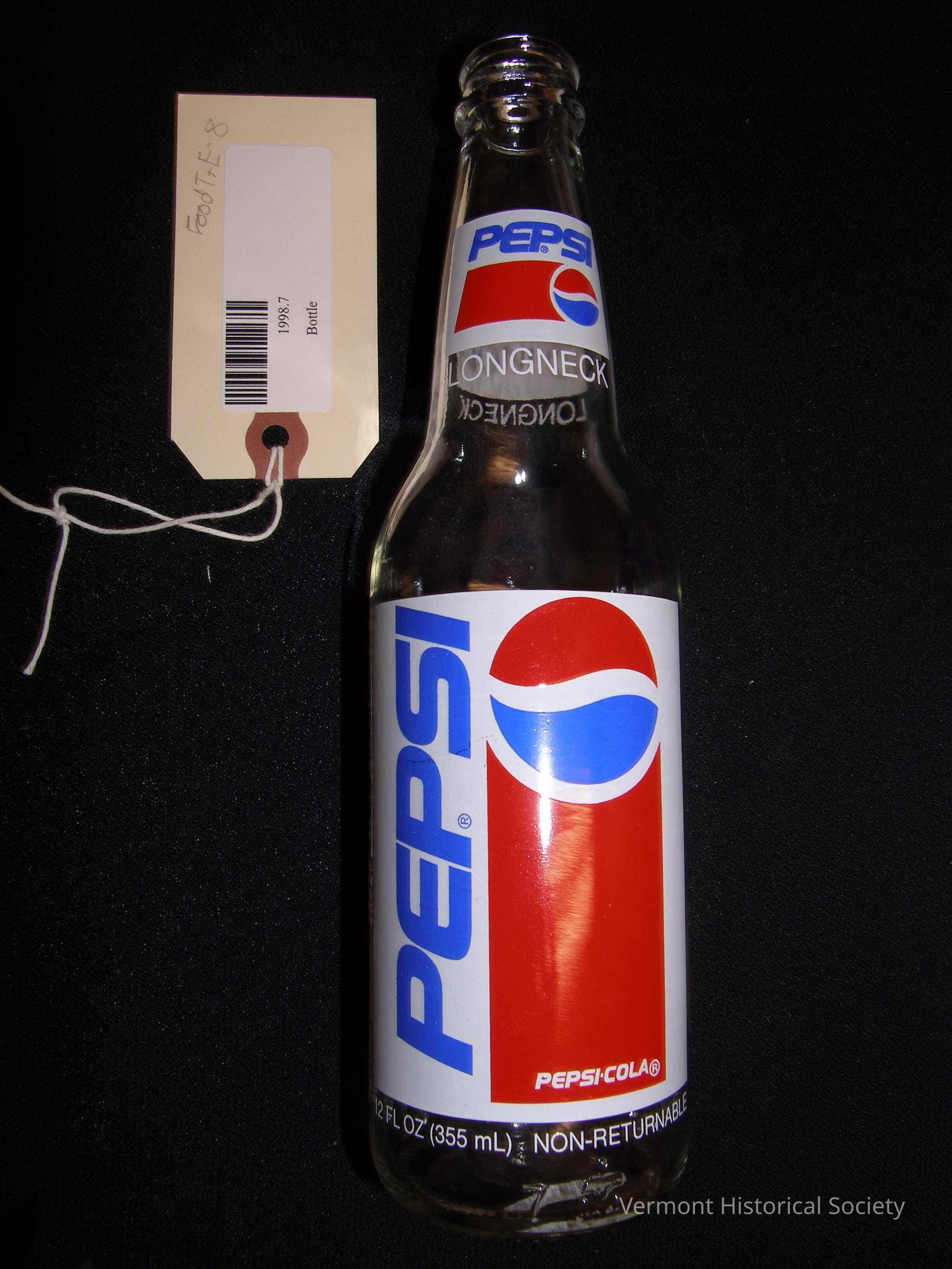 A "longneck" soda bottle from Pepsi. One side panel reads: "1996 NY-PENN/LEAGUE/VERMONT/Expos/CHAMPIONS" Stamped with "REFUND 5c CT-NY/MA-VT-ME-DE" Blue ink near "shoulder" of bottle "MAR 09 (blurred)/ 1001BV60497"