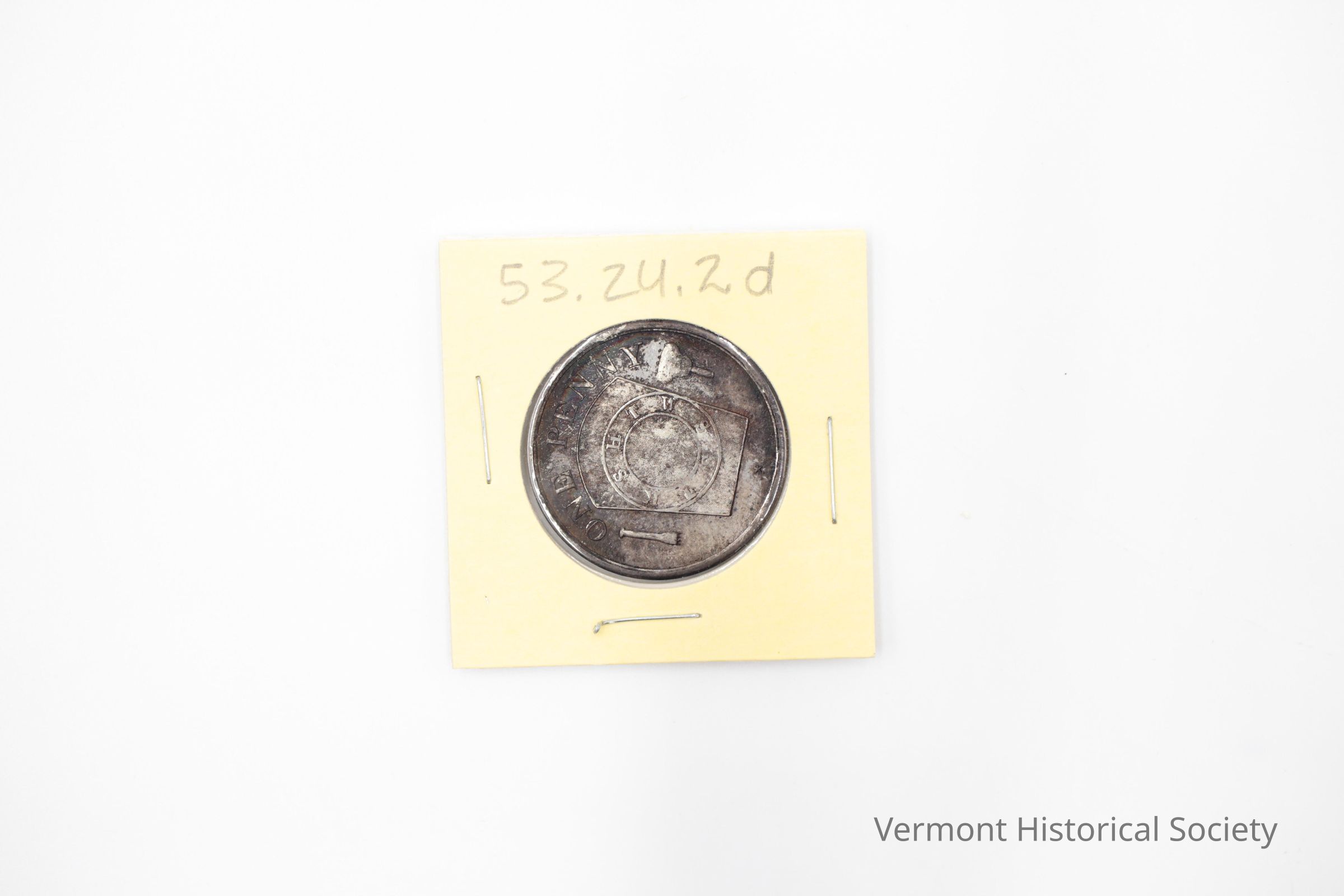 Aluminum token the words "ONE PENNY" on the obverse with an olive branch at the bottom, a tablet with a circle of initials "H T W S S T K S" in the center, a chisel, and a funnel. On the other side of the coins are the words, "Cleveland Chapter No. 20 R.A.M. Newport, Vt."Use