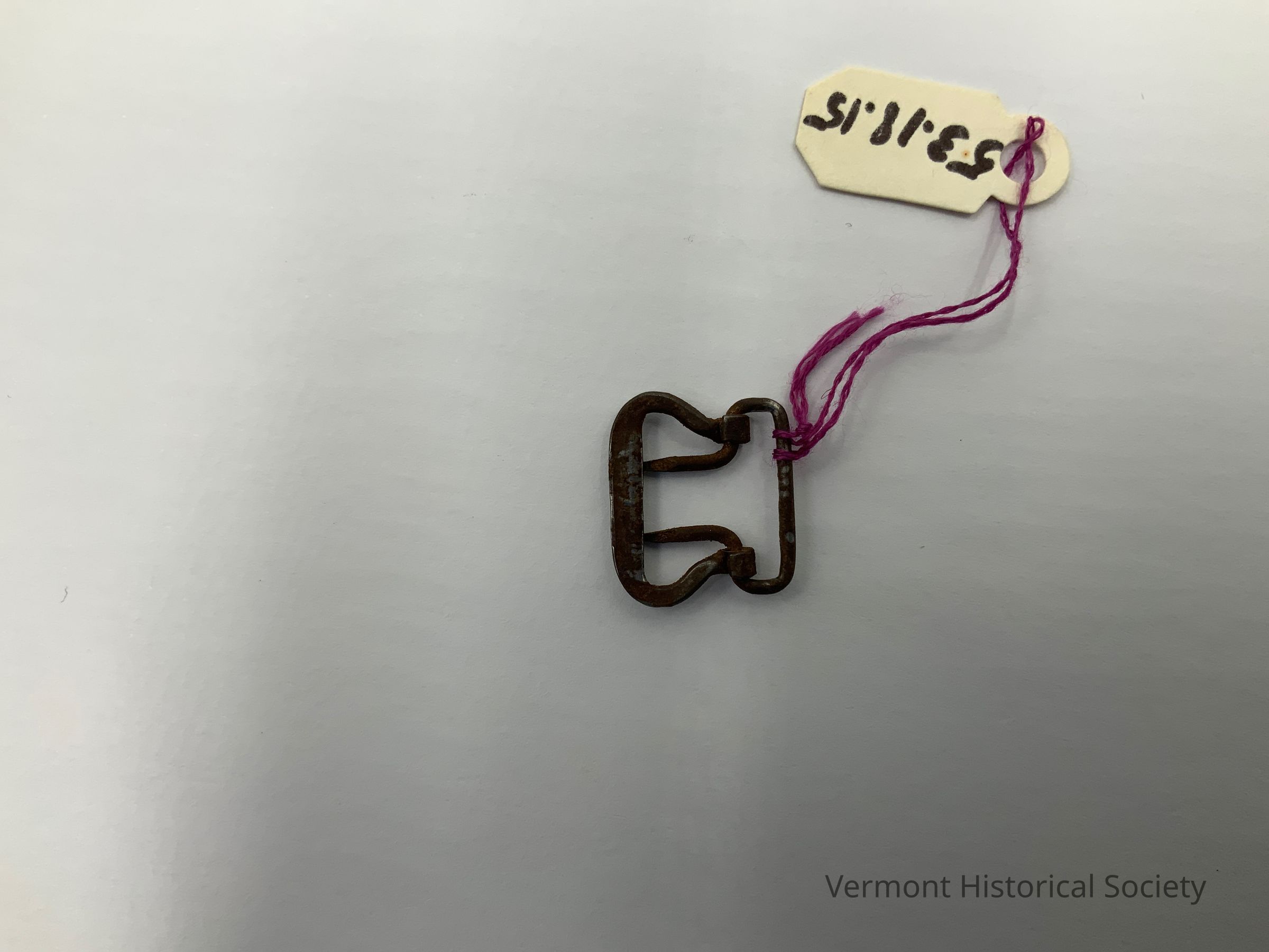 Small metal buckle, likely from a piece of jewelry. The buckle has two central prongs.