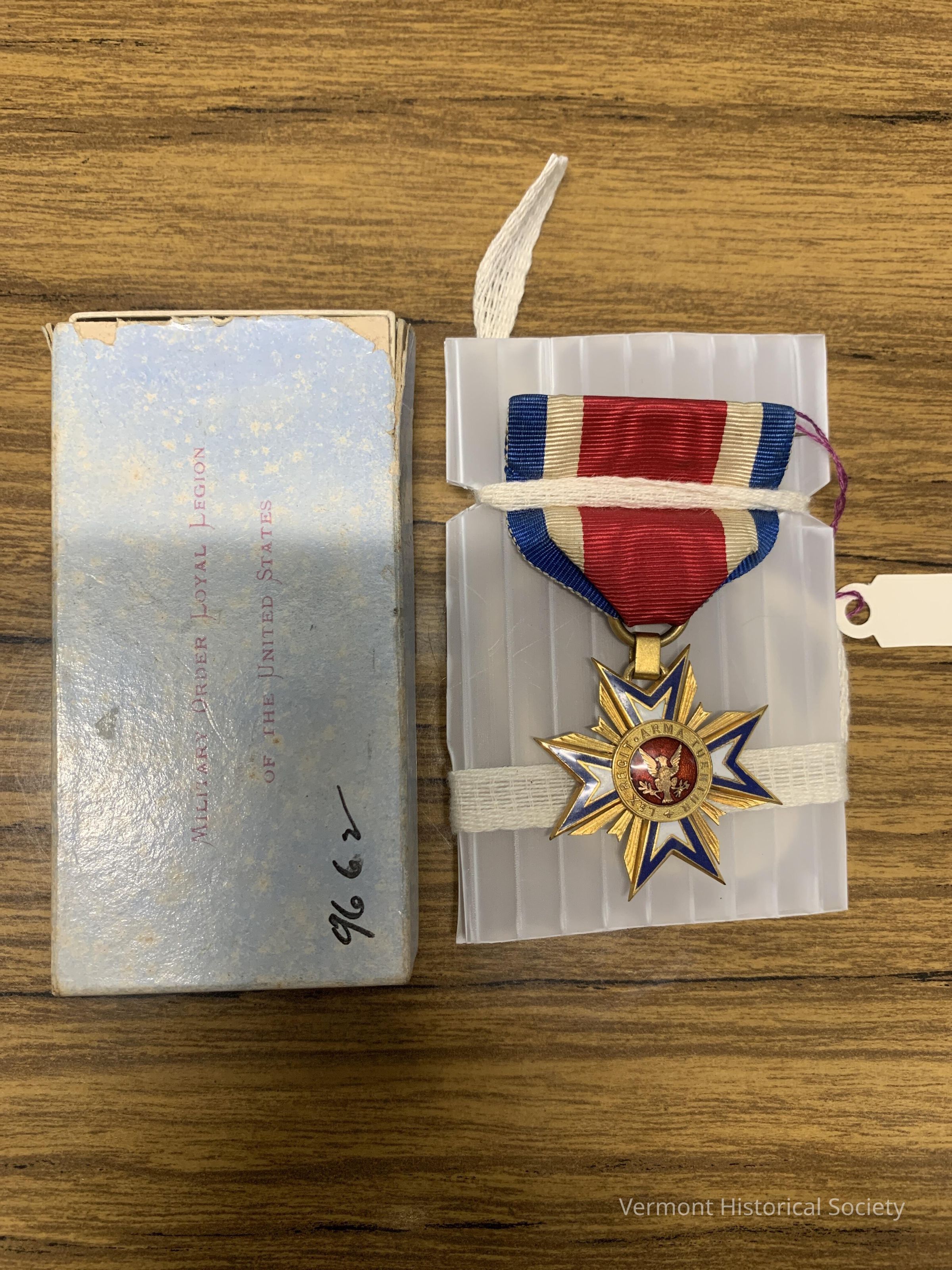 Enameled medal in the shape of a Maltese cross hanging from a red, white, and blue striped grosgrain ribbon. The arms of the cross are enameled white lined with blue and there is a red circle in the center with a gold spread eagle surrounded by the inscription, "LEX RECIT ARMA TUENTUR". The back of the medal has a fasces in place of the eagle, and the inscription, "M.O. LOYAL LEGION U.S. MDCCCLXV".Context