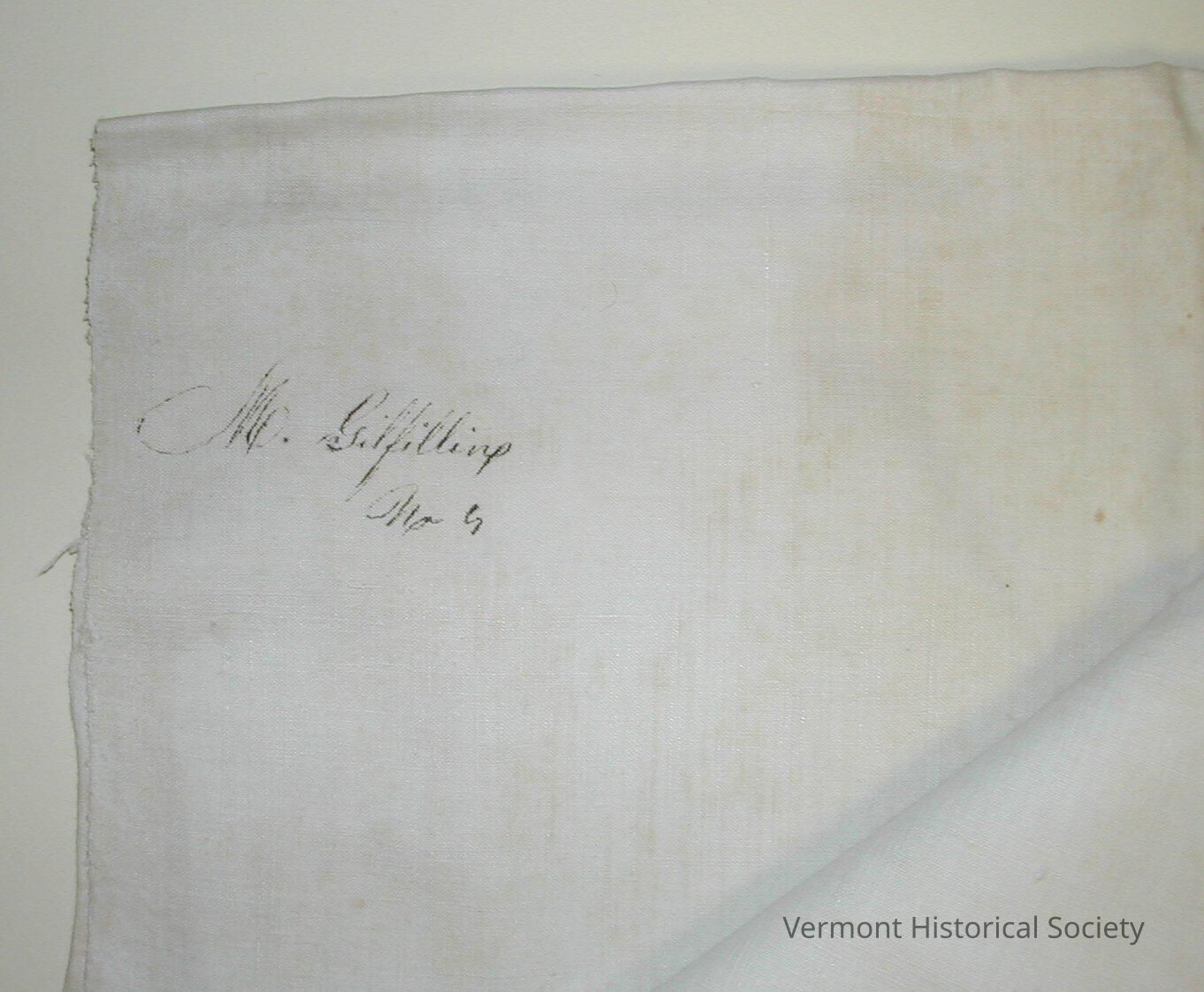 Half of a linen bed sheet. One corner of the sheet has the inked label, "M. Gilfillin No 4".Context