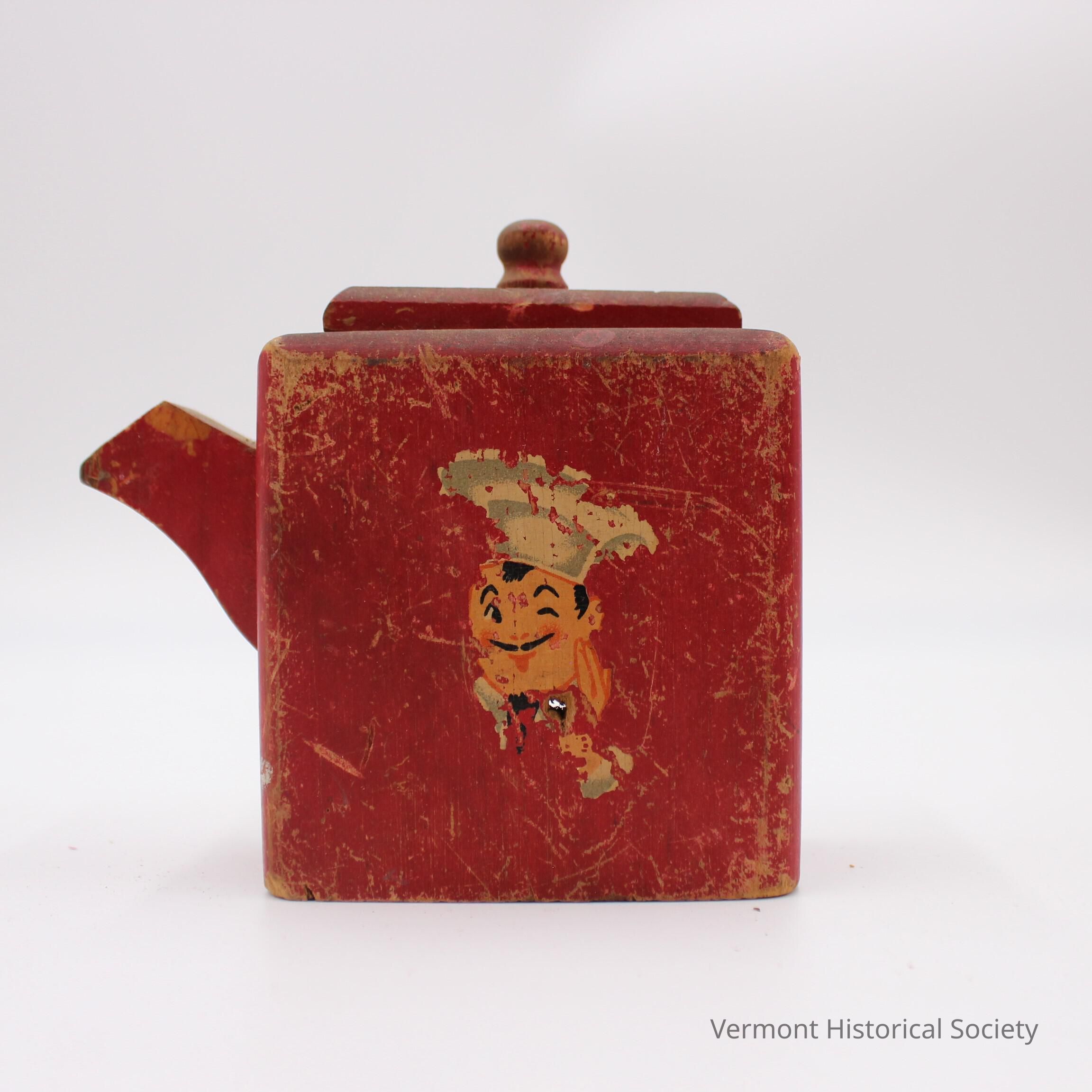 Small storage box in the shape of a teapot. The front bears a cartoon image of a chef.Context