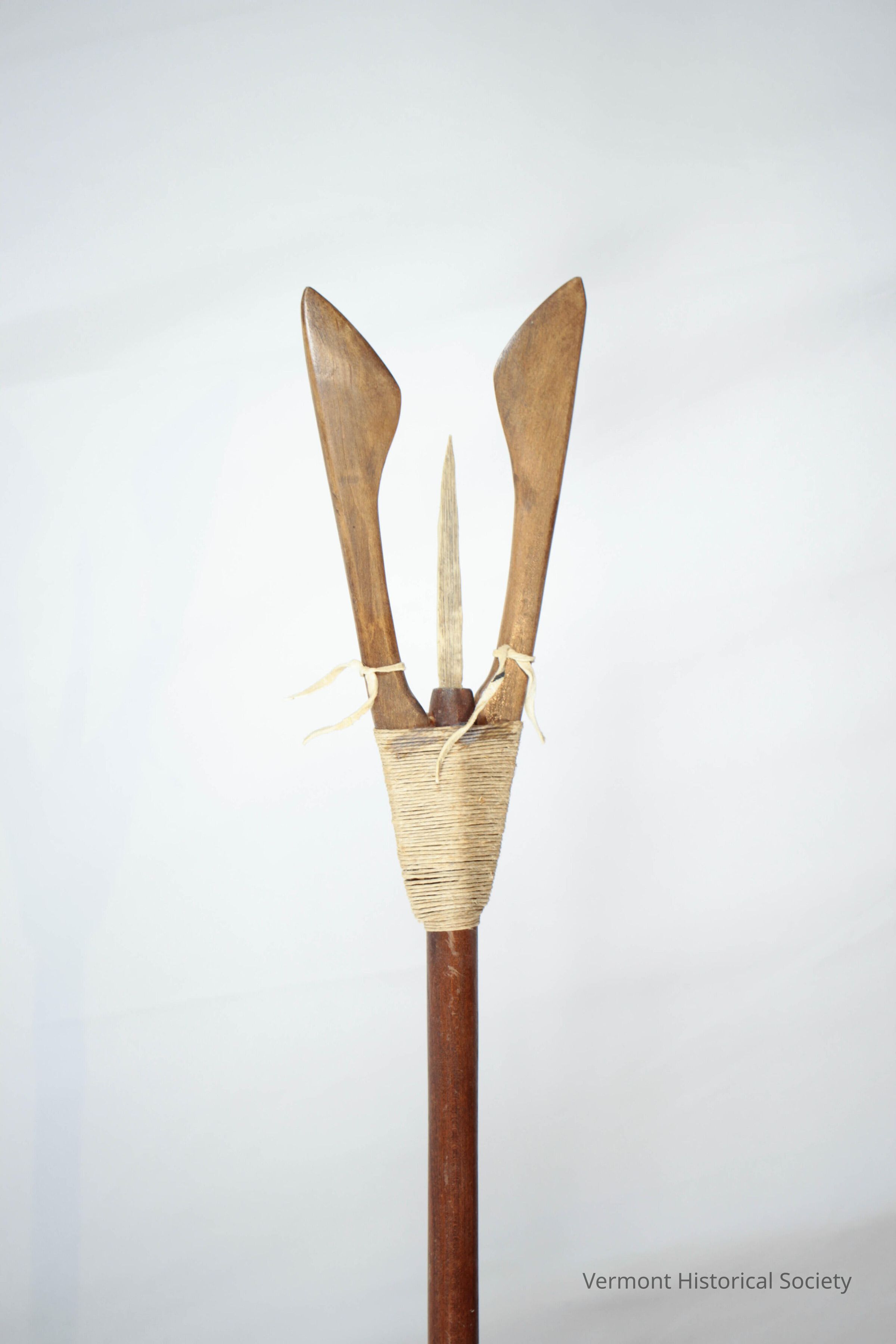 Wooden fishing spear consisting of a long turned wooden handle culminating in two side wings and central carved spike. The wings are held onto the handle with jute twine, and the spike is inserted into the center of the handle.