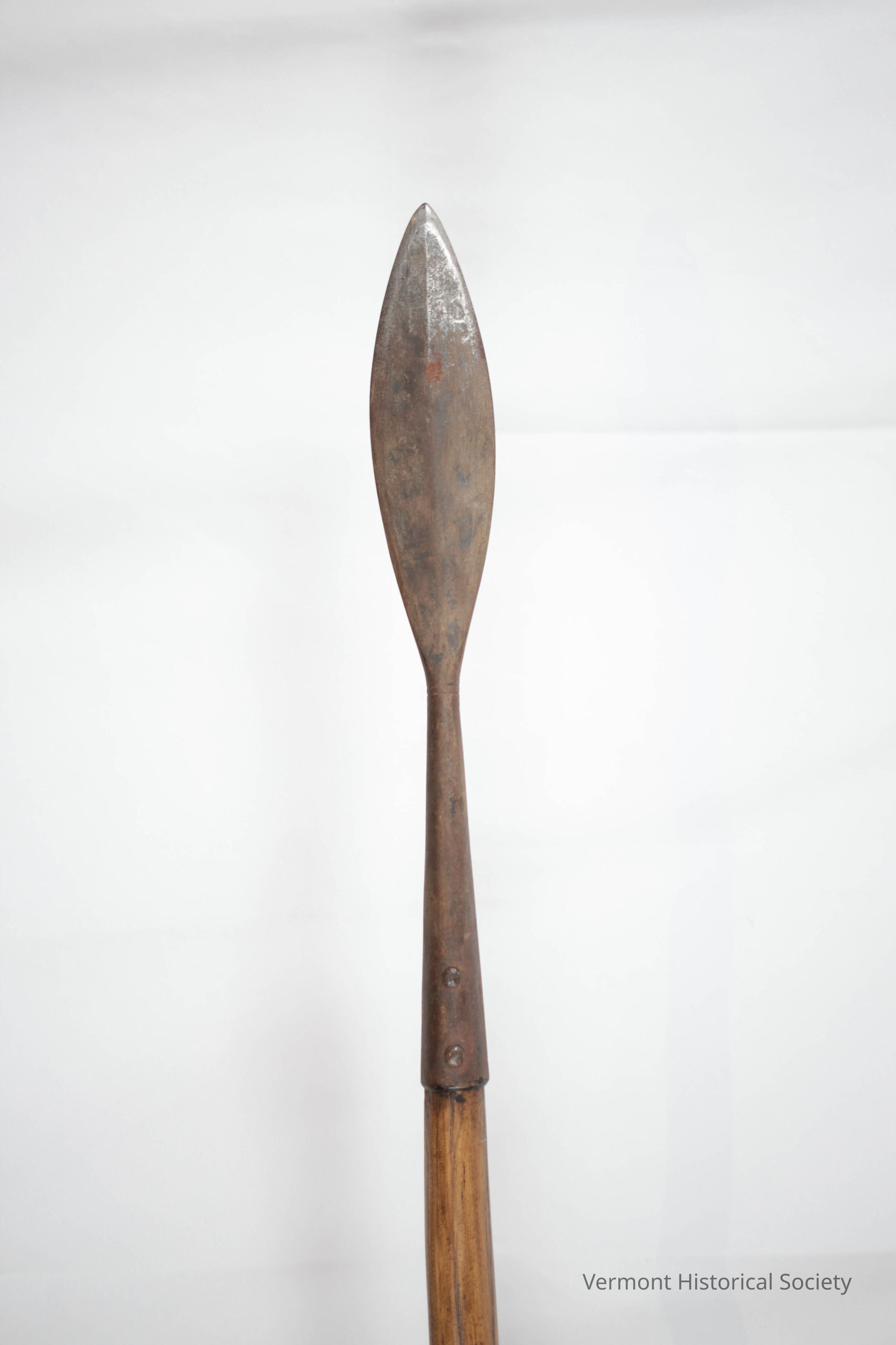 Spear consisting of a metal head/tip and a long wooden shaft. The shaft is turned wood, consistent in width until it reaches the metal tip. The tip fits over the shaft, and is held with two bolts or screws.