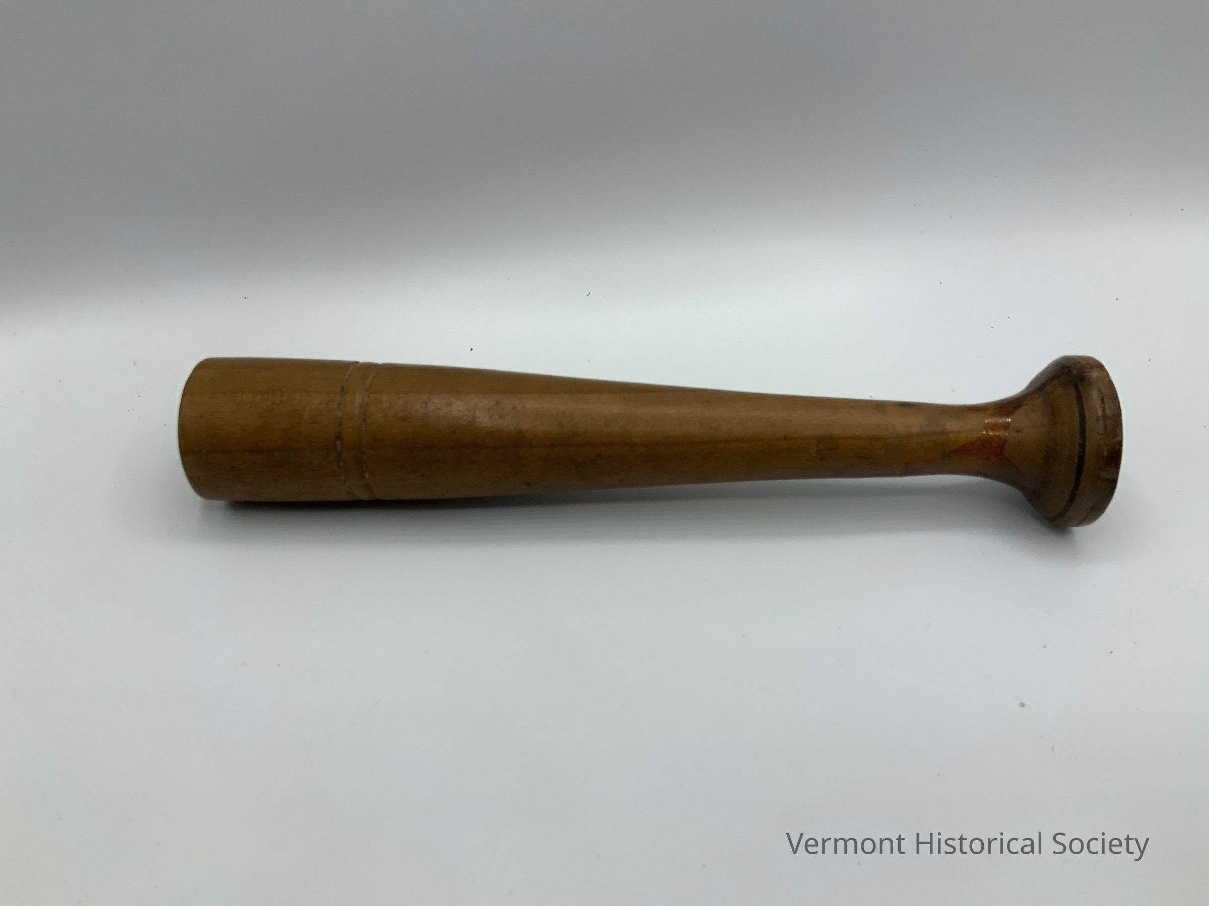 Large turned wood bobbin resembling a baseball bat in shape. One end is narrower than the other, with a disk capping the narrow end.