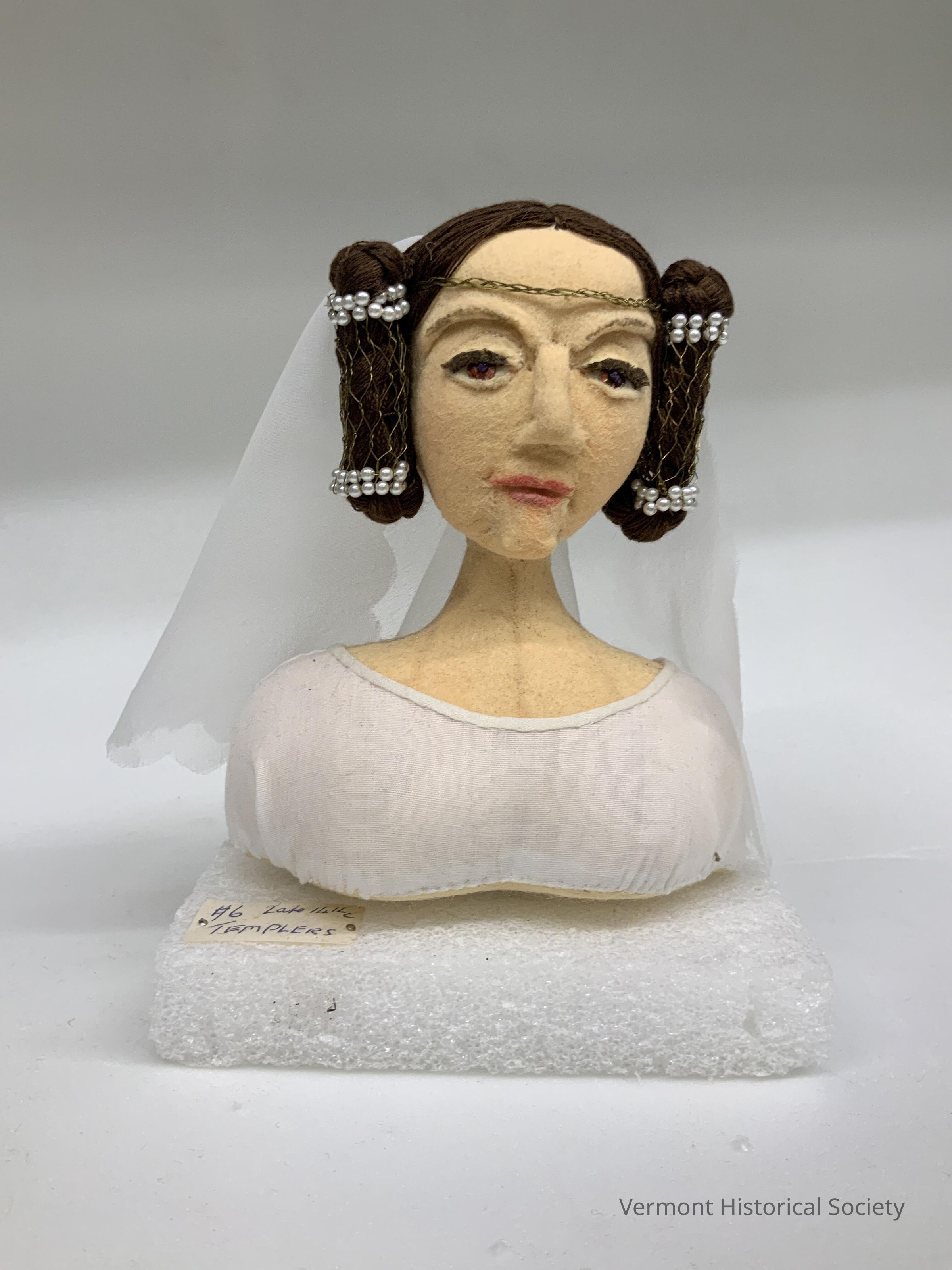 Felt bust of a woman. The face is artistically structured with a distinct seam beneath the eyebrows and needle-felting lines along the sides of the nose to the bottom of the chin. The felt is painted to resemble white skin, with pink lips and brown eyebrows. Eyes are created with brown sequins as irises and lacquered embroidery thread as eyelashes. The figure has brown hair made of thread. The body is covered in a partial garment made of white cotton with a wide neckline.