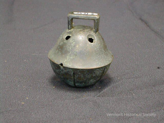 Round, ball-shaped bell. There are four holes holes punched around the top, and the bottom is slitted. There is a metal ball inside and a square bracket at the top.