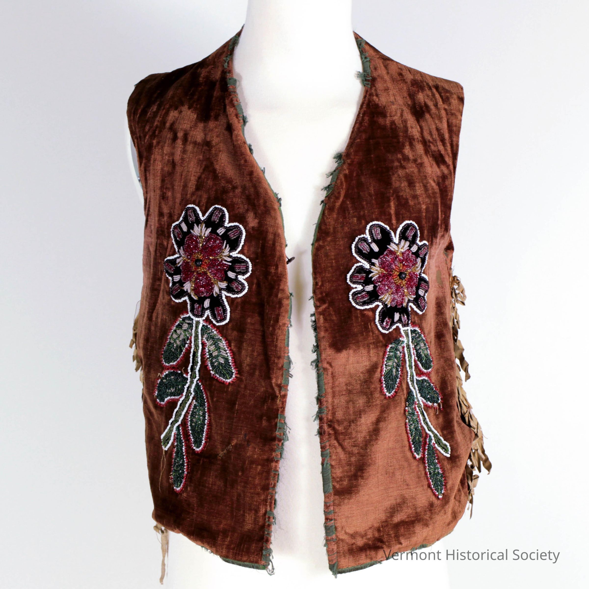 Brown velvet vest decorated with appliqued beadwork flowers. The front is decorated on either side with matching beadwork flowers, each with ten black and purple petals. The centers of the flowers are pink, yellow, and white, and they each have five green leaves down the long stem. The inner edges of the vest are bound with green ribbon (now largely deteriorated), and the bottom is bound in light-colored leather. The side seams are decorated with leather fringe. The vest is unlined.Context