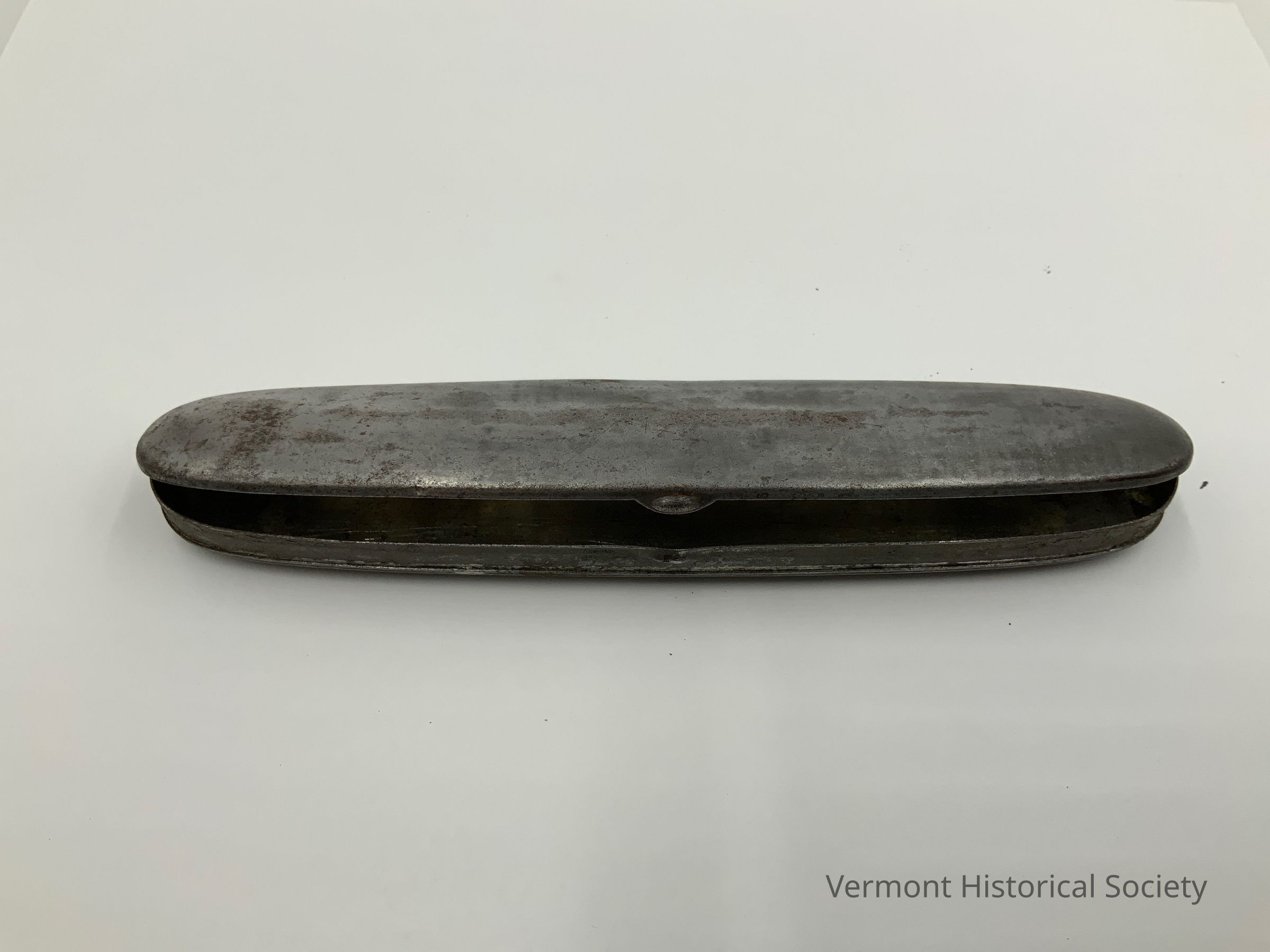 Oval metal eyeglass case. The case hinges open at one of the long sides.