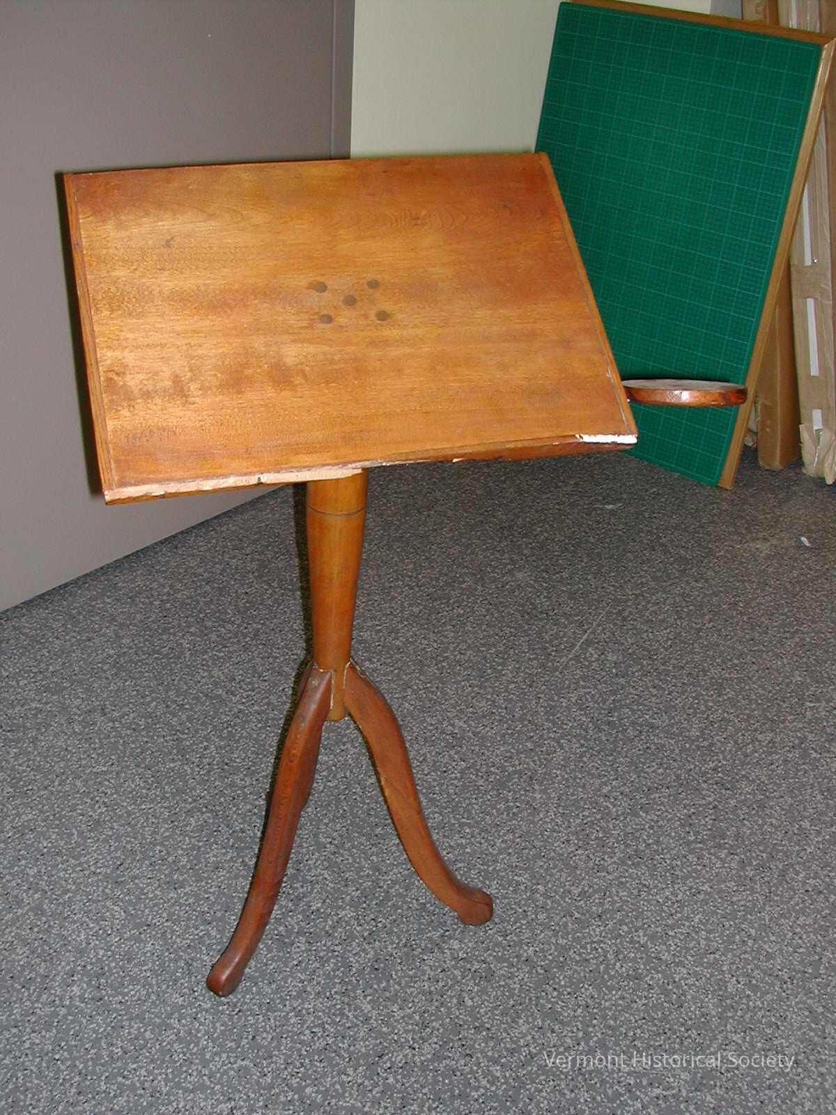 Wooden book stand with three legs. The legs are plainly formed, with rounded feet. The center post is turned and inscribed with a ring about halfway up. The top of the stand is a rectangle tilted at a 45° angle. At the bottom edge is a wooden protrusion for holding a book, now mostly broken off. There is a small, round disk attached with a metal rod to the right side of the stand for holding a candle.
