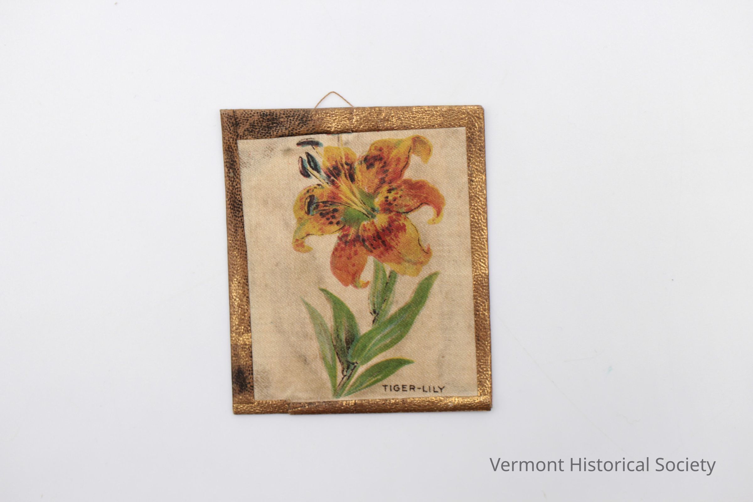 Miniature wall hanging sized for a dollhouse. The piece consists of a small print showing a tiger lily on cardboard. The edges are bound with textured, metallic tape. There is a doubled loop of gold thread at the top for hanging.Context